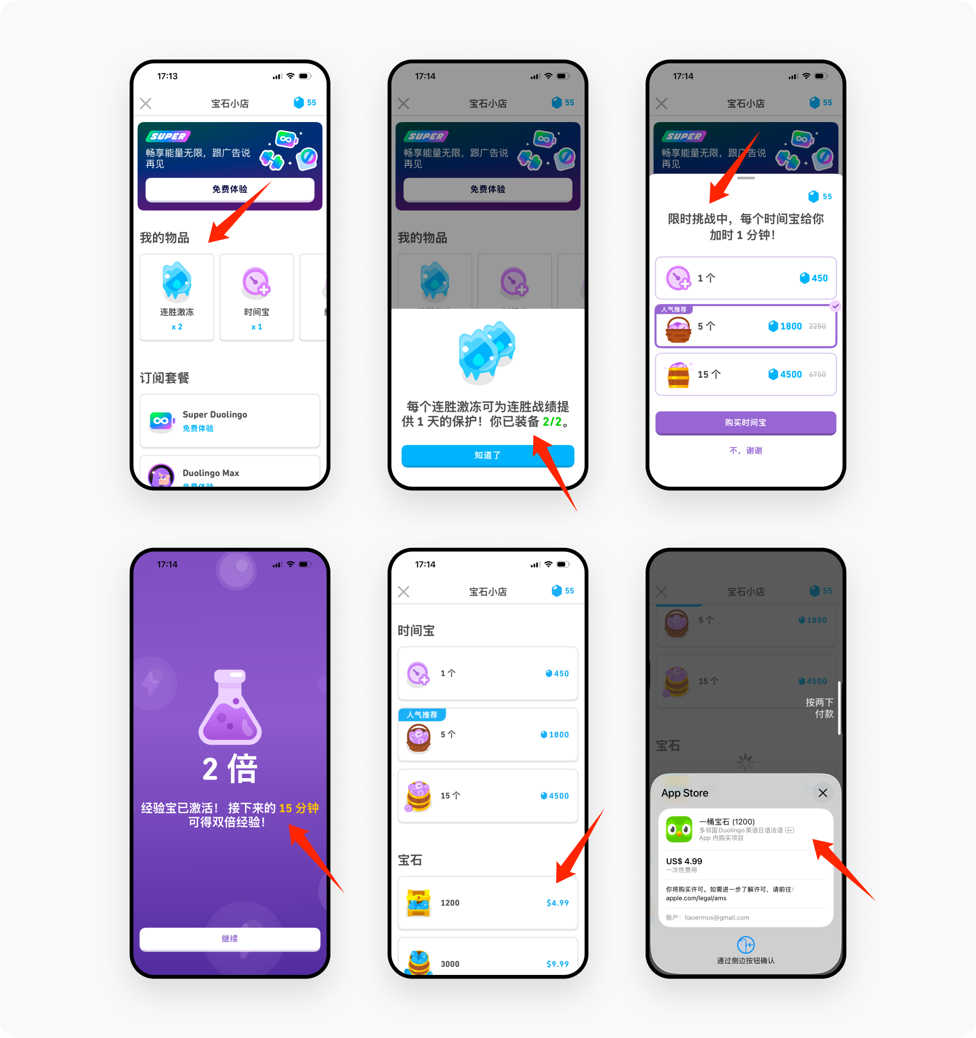 多邻国通过”宝石小店”构建了一套高度游戏化的虚拟经济系统。用户使用宝石购买经验包、时间包、连胜保护等功能性道具,这不仅增强了学习的策略性和趣味性,还让学习成果与虚拟奖励体系产生正向联动。道具设计赋予用户更多自主控制权,实现”学习即游戏”的体验闭环。