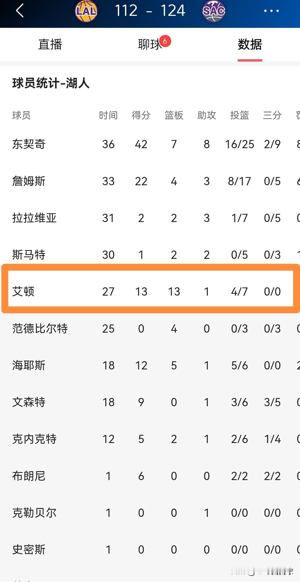 我强烈建议湖人主帅雷迪克给予艾顿更多的出手数!在今天湖人客场以112:124不敌国王的比赛中,艾顿在首发出战的27分钟里,投篮7中4,其中罚球8中5得到13分13篮板2盖帽,他的场上正负值为-12。 作为湖人的首发中锋,艾顿仅仅得到了7次出手机会,这真是太不正常了,尤其是本场比赛湖人的三分投篮失准,雷迪克教练应该增加艾顿在篮下的进攻次数才对。
