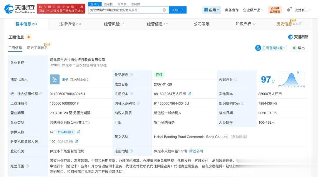 天眼查工商信息显示,近日,河北保定农村商业银行股份有限公司发生工商变更,注册资本由8.5亿人民币增至约8.8亿人民币,增幅约3.7%。