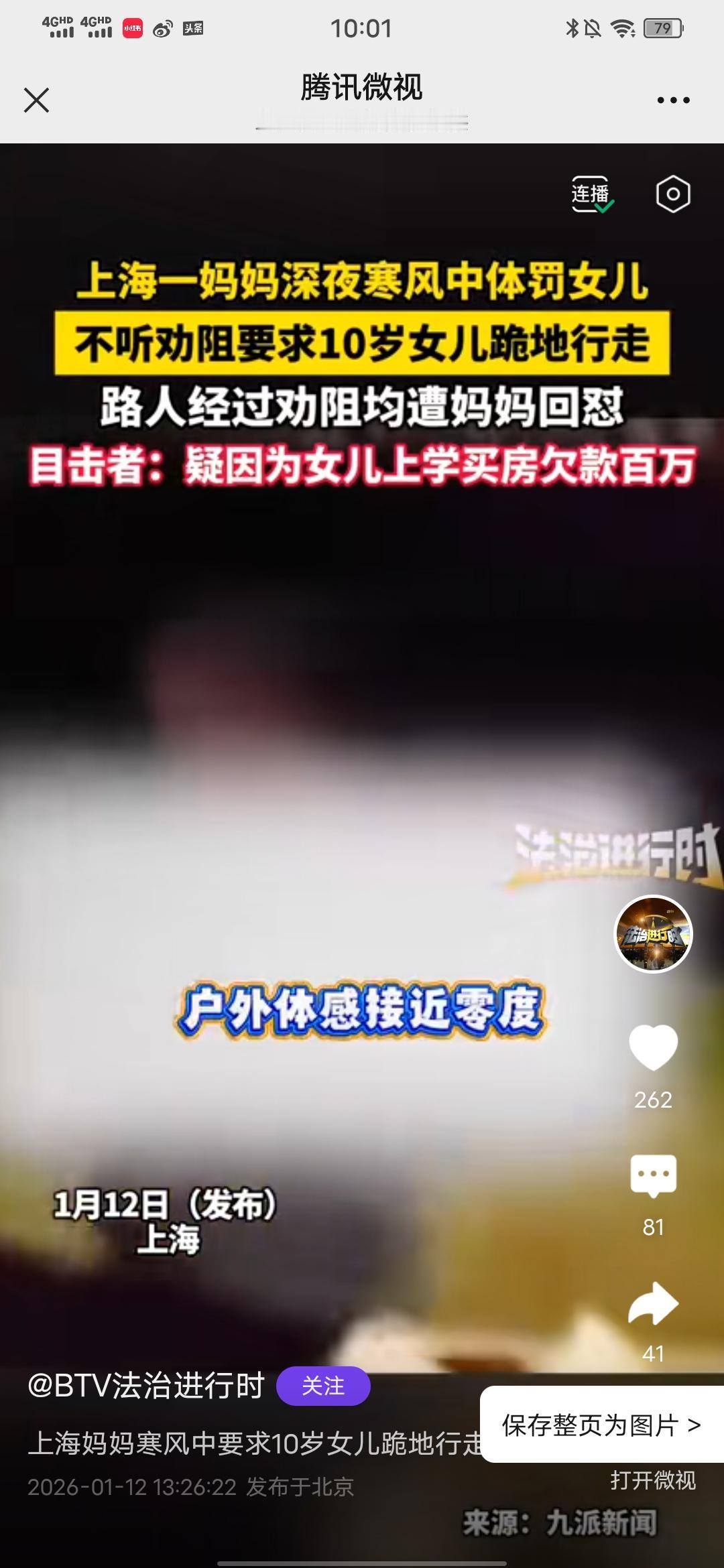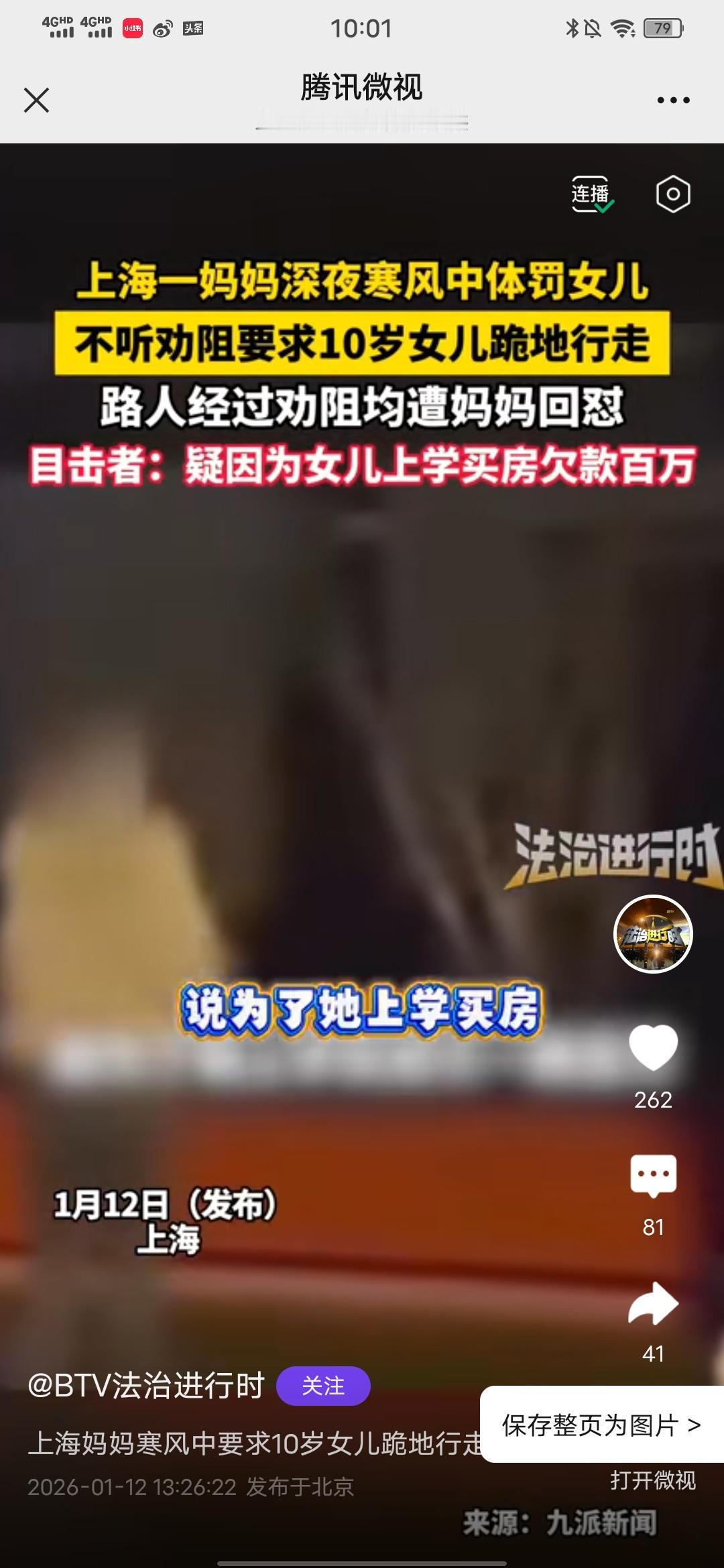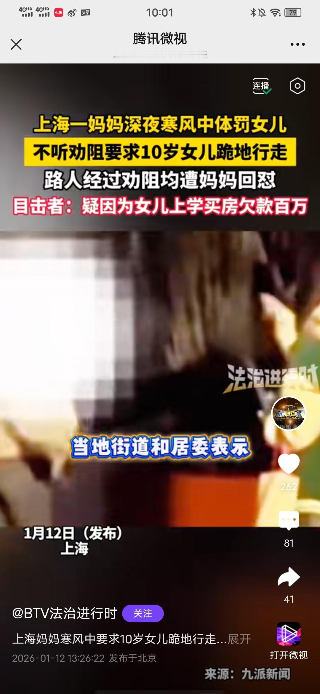 不要因自己的无能把孩子当出气筒! 上海妈妈寒风中要求10岁女儿跪地行走,路人劝阻遭回怼,目击者:疑因女儿上学买房欠款百万! 刚在BTV法治进行时平台看到的消息,昨天,在上海一女子体罚10岁 女儿跪地行走,体感温度接近零度。路人看不下去了对其进行劝阻,却被这位上海妈妈怒怼。其中一位路人许先生听了个大概,就是因为女儿上学买房。所以欠了一两百万,目前还在欠款中,当地街道和居委表示会持续关注她家家庭教育情况! 因孩子上学买房,是哪个的决定?是你做家长的的决定,体罚孩子算什么本事?还有就算你觉得为了孩子上学买了房,欠了款,压力大,可孩子却不爱学习,成绩差,适当惩罚或许有必要,但体罚就是不对的,这么寒冷的天,让一个孩子众目睽睽之下跪地行走?有没有考虑过孩子的自尊心会受到伤害?难道花了几百万买个房子,最后培养出一个心理扭曲,心里没有温暖,只有阴狠的孩子是你们的初衷?10岁的孩子就是个上小学四五年级的孩子,冻坏了难道家长心里不心疼?这个年龄段的孩子有强个人意识了,马上就要进去青春期了,有些都开始叛逆了,会非常敏感了,不要急于一时啊,要静待花开啊。 为了孩子上学买房是你大人的责任,不要把这个怨气发在孩子身上。退一万步说,就算孩子真就不是读书的料,那他必然有其他优点和特长,善于表扬和鼓励,效果会好得多!愿每个孩子的童年都被温柔以待!