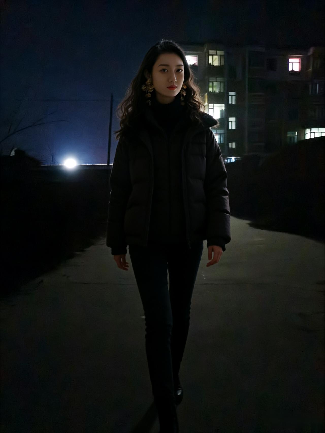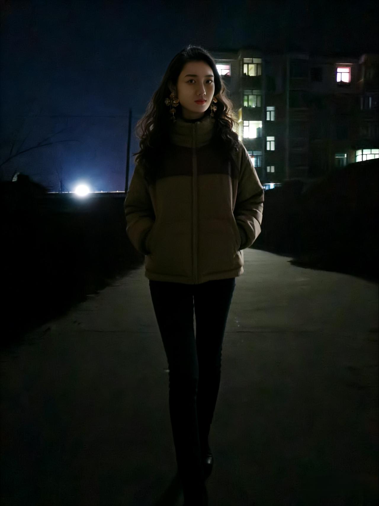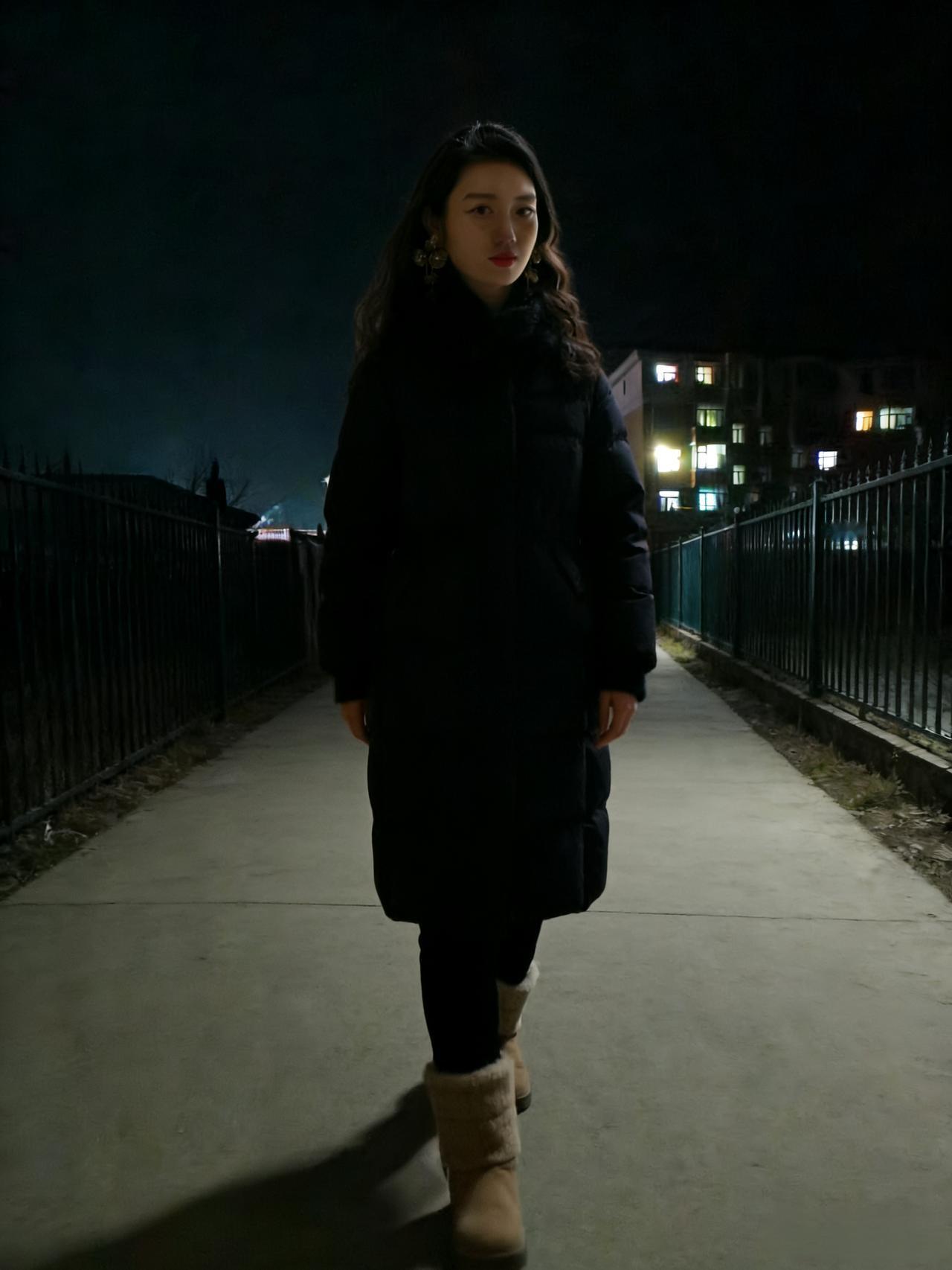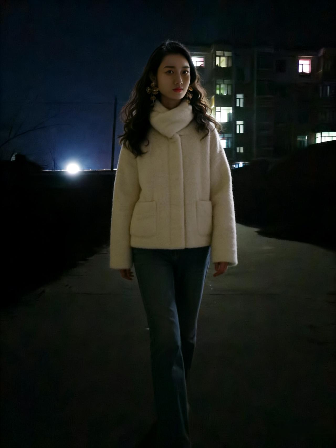夜色漫城街似练,华灯初上时分。佳人踏雪步轻匀。 貂裘温冷意,羽衣惹芳尘。 眸底星