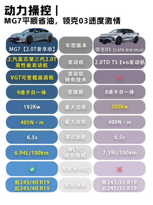俩车都是2.0T,领克03调得比较冲,油门跟脚,开起来很“跟手”,适合爱开车的人,不过得吃95号“细粮”。MG7配的是9AT,换挡更平顺,日常通勤很舒服,过弯很稳,喝92号油就行,长远看能省一点。