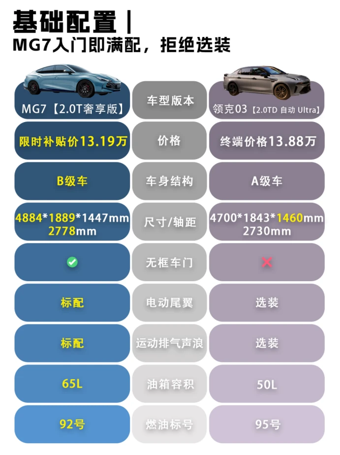⭐最后来看下价格:MG7 2.0T奢享版13.19万,领克03 Ultra 13.88万。看似只差7000,但领克03想要达到同样的配置水平,光是尾翼就要加8000。