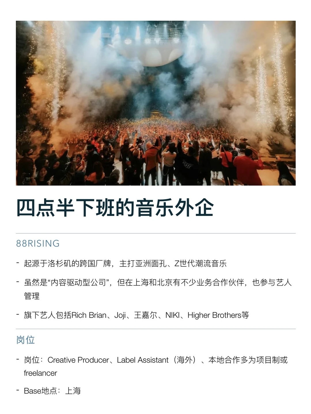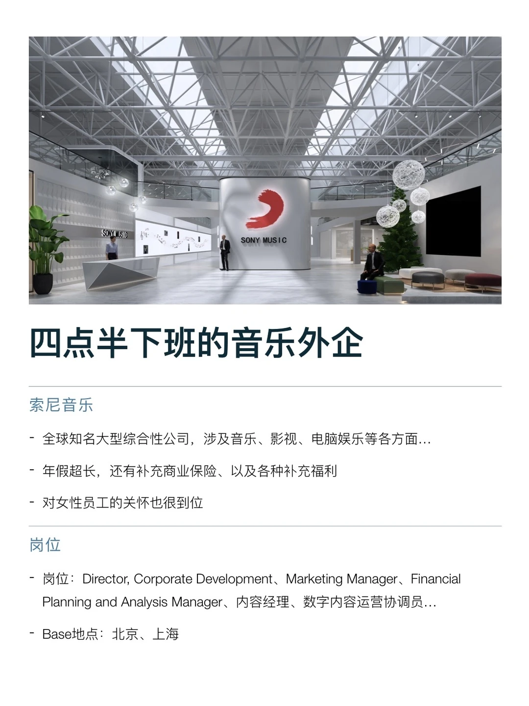 音乐外企真的很适合女生,氛围轻松、有创造力,日常工作也会比传统行业更有趣一点。包括节奏福利也都很好 图上整理了几家不错的外企,像环球音乐、索尼音乐这些都很香,有做唱片、艺人内容、音乐营销、新媒体推广相关的,环境氛围这些都还挺好的 节奏整体比较松弛,多数是 955 + 弹性,年假一般 12–15 天 起,福利也很齐全。偶尔还能参加参加活动、看看演出、接触一些艺人项目 如果本身就对音乐这方面感兴趣的,真的可以去试试 坚持日更✊🏻,对外企感兴趣的欢迎常来看看