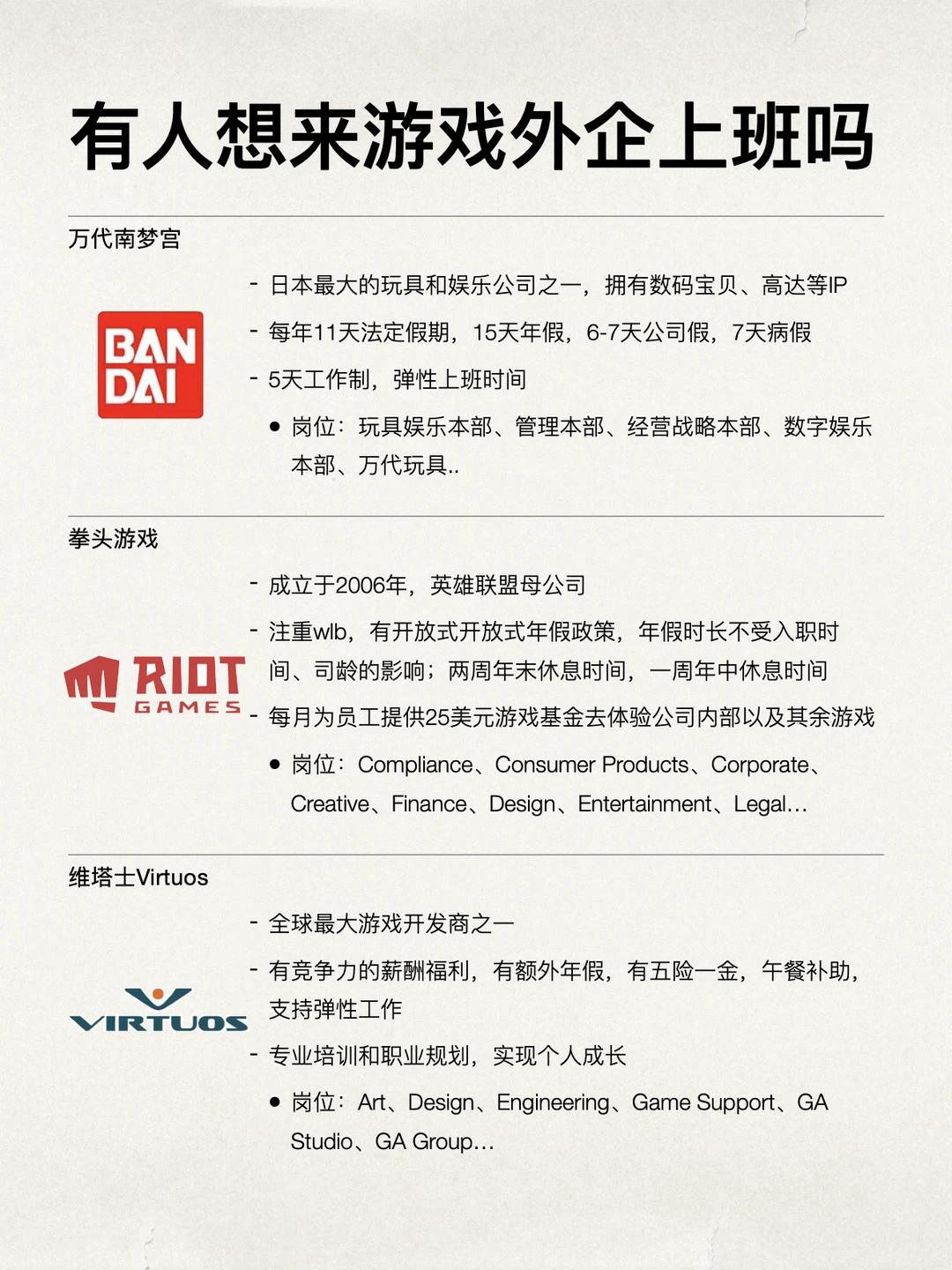 爱打游戏的真的可以去试试游戏类外企,像育碧、拳头游戏、超级细胞这些,都蛮香的 给大家整理了几家还不错、加班少,有些0经验也可以去试试,多的年假有20多天,而且整体上下班时间很灵活,wlb,氛围都比较轻松自由 岗位上,美术、设计、游戏支持、市场、经营战略、甚至职能支持这些岗位也一直都有需求,而且整体氛围很好,对女生其实也是比较友好的 坚持日更✊🏻,对外企感兴趣的欢迎常来看看