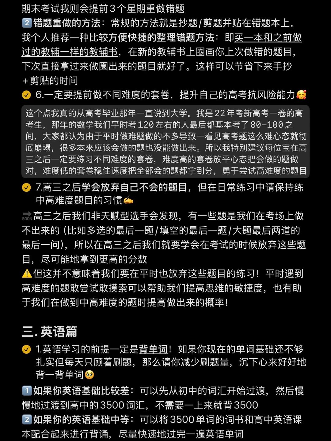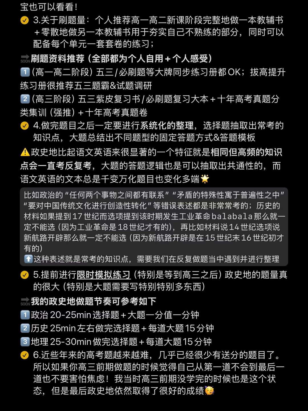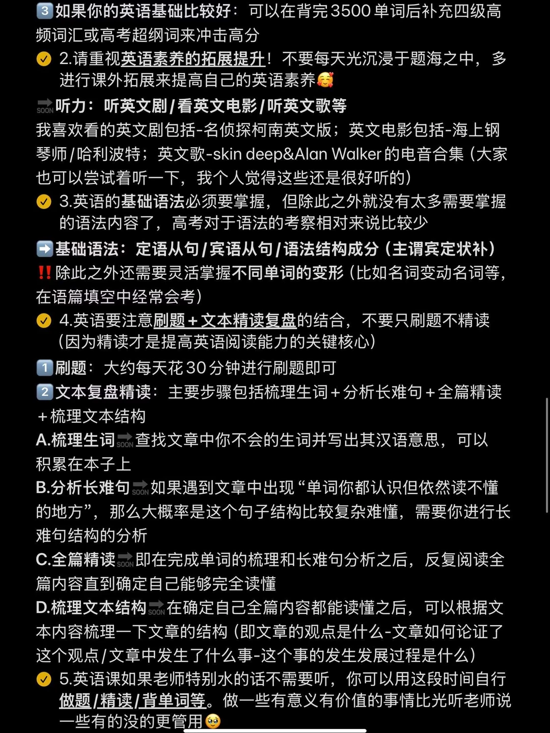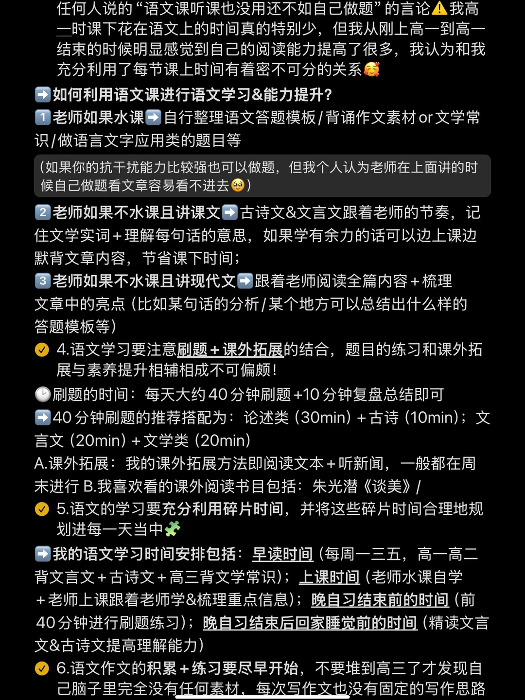 哈喽大家好! 今天给大家分享一期文科生600+的各科学习攻略 之前其实我已经分享过很多期高中学习方法了 所以今天这一期更侧重于“高中各科学习的冷知识”,主要是想给帮助大家规避一些学习误区/明确做哪些事情是正确的哪些事情是无用功 希望大家都能找到更适合自己的学习方法😎 🔜本篇详细内容都在图里啦! -之前我也更新过一些其他的学习方法&高中时间安排规划啦 在主页里我给大家分成了不同的专辑💿 有需要的宝欢迎查看👋