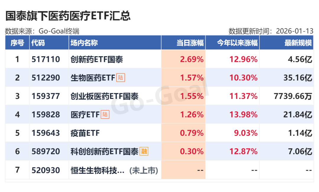 创新药ETF国泰(517110):跟踪中证创新药产业指数,覆盖A股创新药产业链核心企业。近期板块在龙头业绩、BD事件及AI医药等多重利好下表现活跃,今年以来涨12.96%。对于看好国内创新药产业长期发展、希望捕捉行业景气度回升的投资者,该产品提供了便捷的一篮子配置选择。