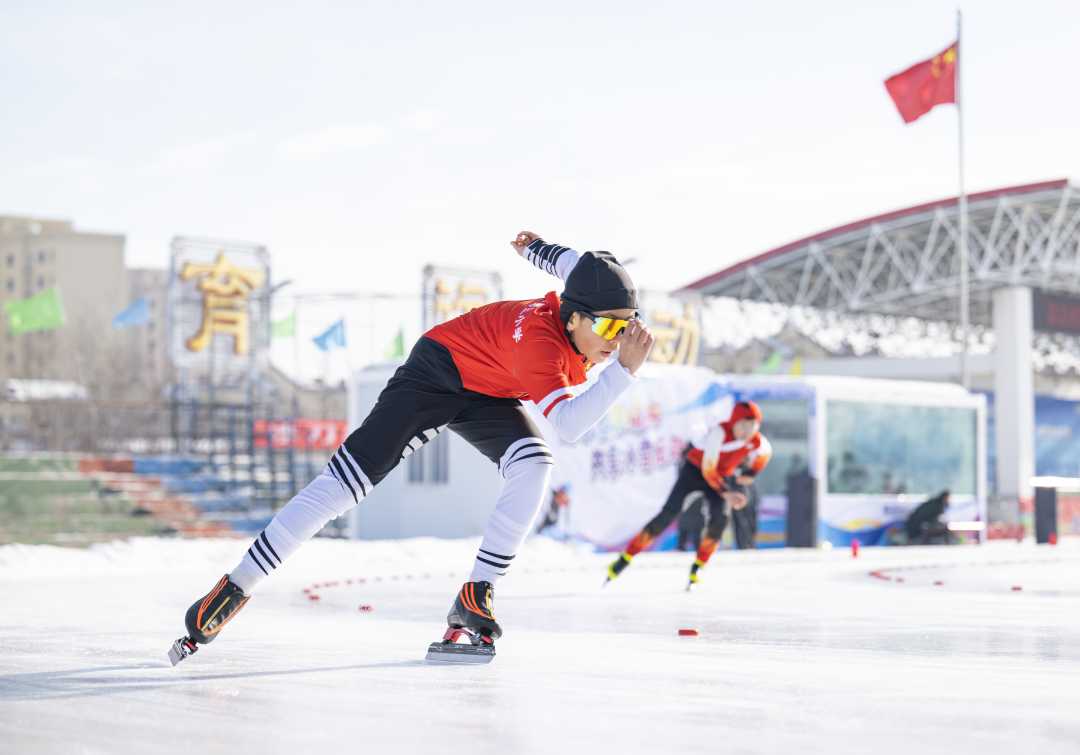 1月12日,新疆维吾尔自治区昌吉回族自治州奇台县第五中学冰场,两名学生在竞赛比拼。