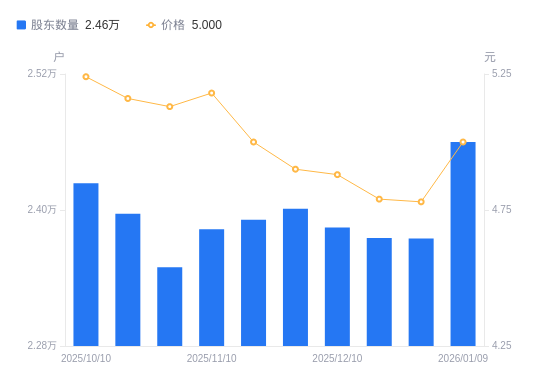 日期A股户数(户)流通A股户均持股数(股)户均持股市值(万元)2026-01-092460125601.5012.802025-12-312374926519.9612.682025-12-192375326515.4912.702025-12-102384526413.1912.892025-11-282401226229.4912.852025-11-202391526335.8813.172025-11-102383026429.8213.692025-10-312349426807.8013.752025-10-202396826277.6413.562025-10-102423725985.9913.62