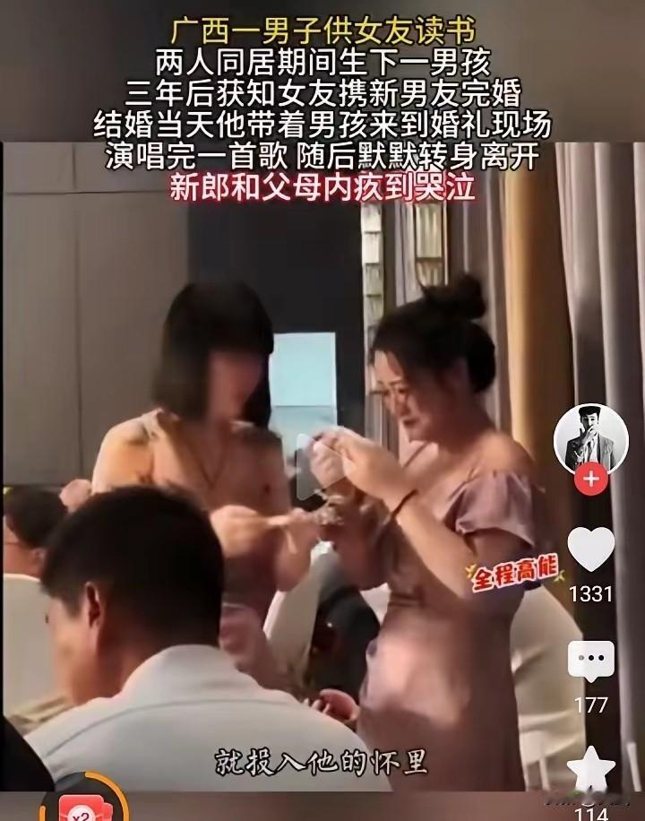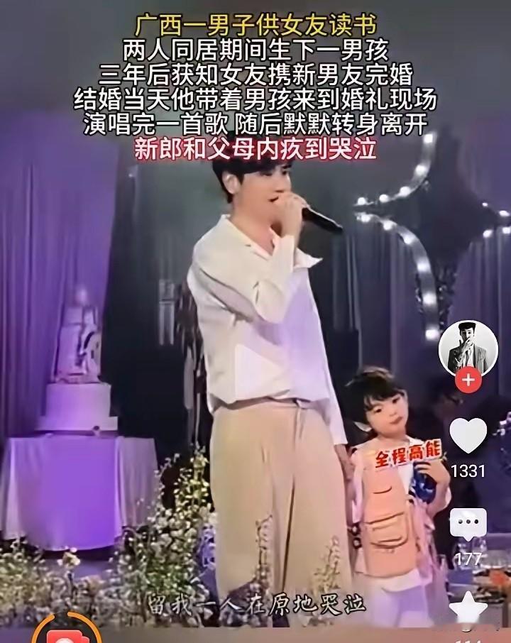 广西一个男人,女朋友考上大学后,家里没钱供她读书,他二话不说,自己省吃俭用,白天在工地干活,晚上还兼职送外卖,就为了把钱都用在女朋友的学习和生活上。 两人同居后,还生了个儿子。他心里盘算着,等女朋友毕业了,两人就能结婚,一家三口过上好日子。可没想到,等来的却是女朋友要跟别人结婚的消息。 婚礼那天,他抱着三岁的儿子去了现场。他没闹没吵,就带着孩子站在台上,唱了首他们以前常听的歌,《往后余生》。歌里唱的,都是他们一起走过的日子,有甜蜜,有辛苦,更有现在说不出的难受。 台下的人一看这情况,都愣住了,有人小声议论,有人觉得他可怜。新娘脸色一下子变得惨白,眼神里全是慌乱和愧疚。 唱完歌,他看着女朋友,觉得她既熟悉又陌生。他没说一句话,就轻轻摸了摸儿子的头,转身带着孩子走了。儿子好像也感觉到了爸爸的难过,乖乖地靠在他怀里。 回到家,他把孩子放到床上,自己坐在窗前发呆。外面夜色黑漆漆的,就像他心里的感觉。他想起了这几年省吃俭用、四处打工的日子,每一分钱都花在了林婉身上,可到头来,什么都没得到。 但他知道,生活还得继续。为了儿子,他得重新振作起来。以后,他要更努力地工作,好好养大孩子。至于和女朋友的那段感情,就让它永远留在心里吧。