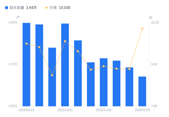 日期A股户数(户)流通A股户均持股数(股)户均持股市值(万元)2026-01-093642411889.6311.932025-12-193686011748.9910.422025-12-103718311646.9310.342025-11-283729811611.0210.392025-11-203710311672.0410.332025-11-103815411350.5210.652025-10-313895811116.2710.752025-10-203780411455.619.952025-09-303892011127.1310.572025-09-193899310581.1910.16