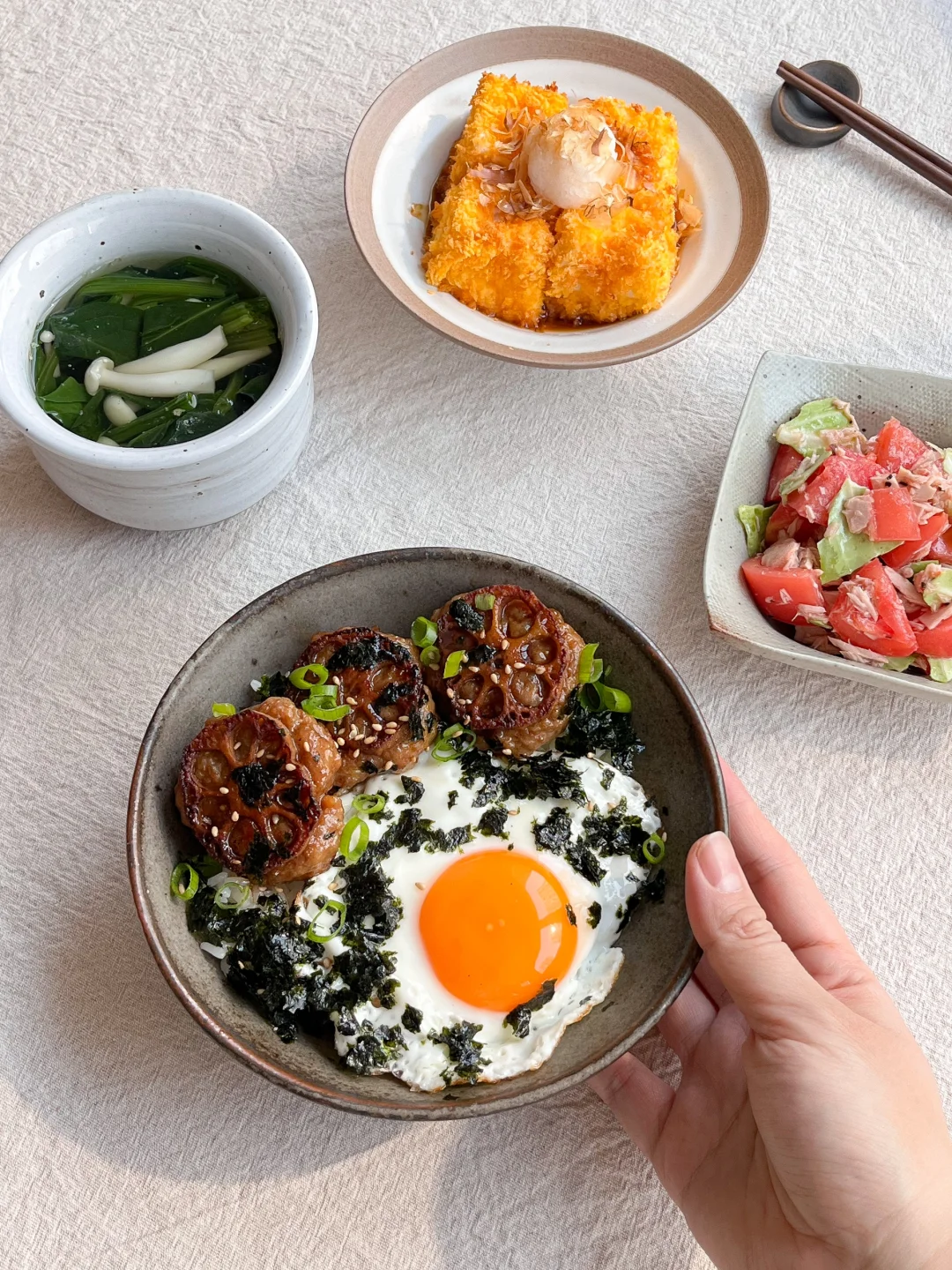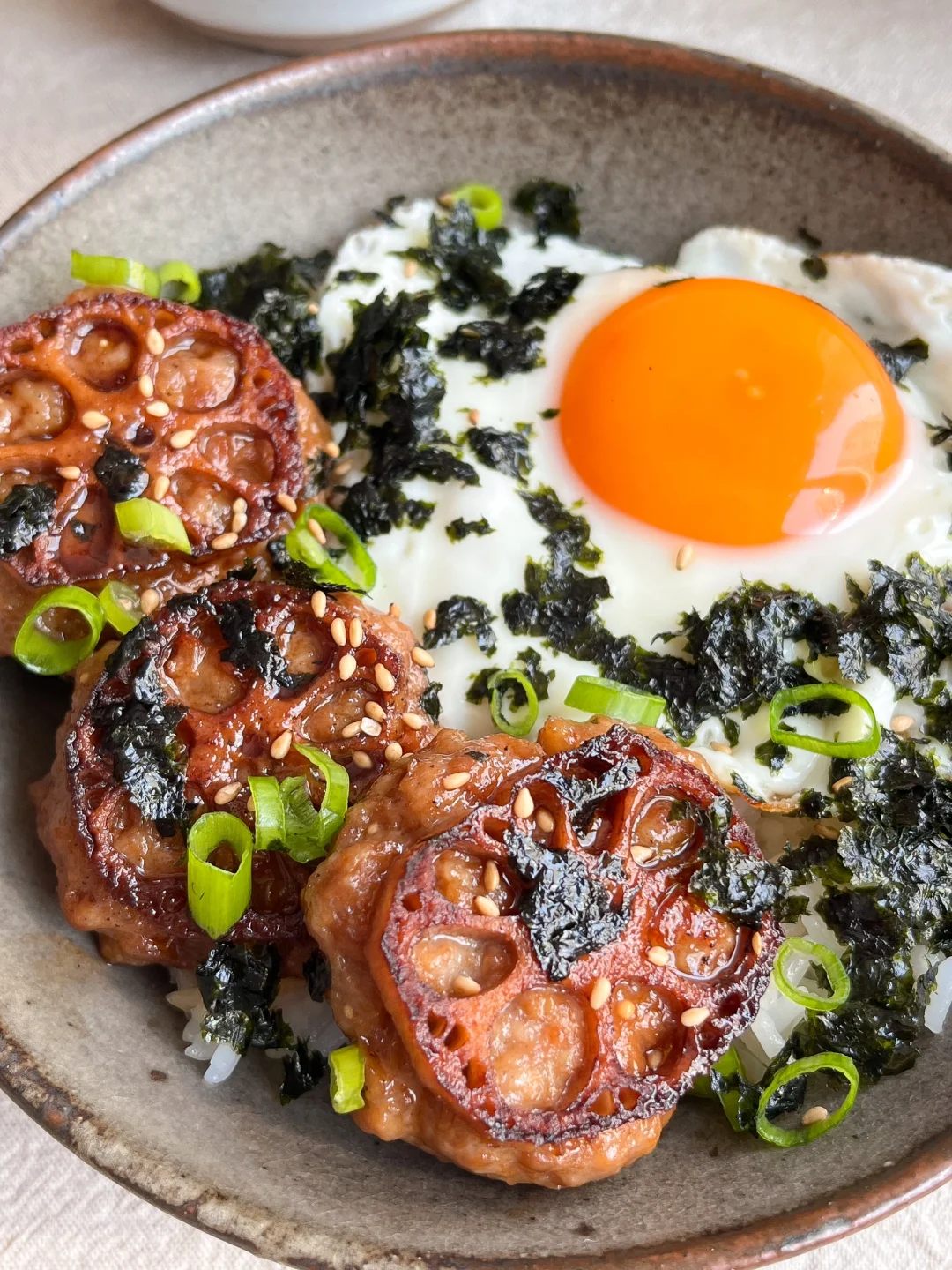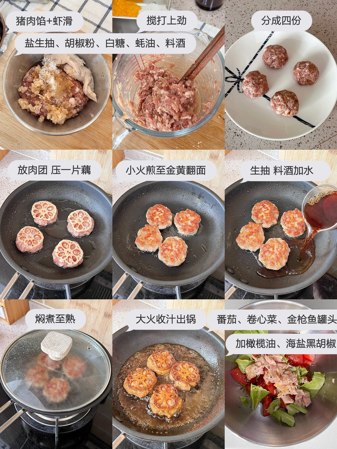 今日午餐: 藕饼煎蛋饭🍳 柴鱼豆腐🥞 小白菜蘑菇汤🥣 番茄拌金枪鱼🍅 今天突然想吃藕盒了 翻了翻冰箱 找了一点肉馅和虾滑 加上藕碎弄一个肉饼 不用切的太碎 带点颗粒吃着更有口感 一点生抽、胡椒粉、白糖、蚝油、料酒、盐 香油 用筷子或手搅拌上劲 团成肉饼 再切一片薄一点的藕 压在肉饼上 热锅冷油 小火慢煎 煎到金黄加一点烤肉酱 刚出锅可别嘴馋 里面很烫的~~~