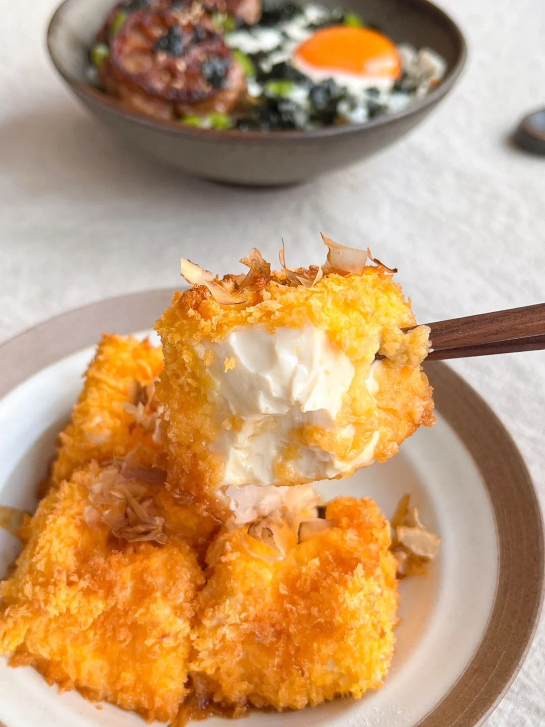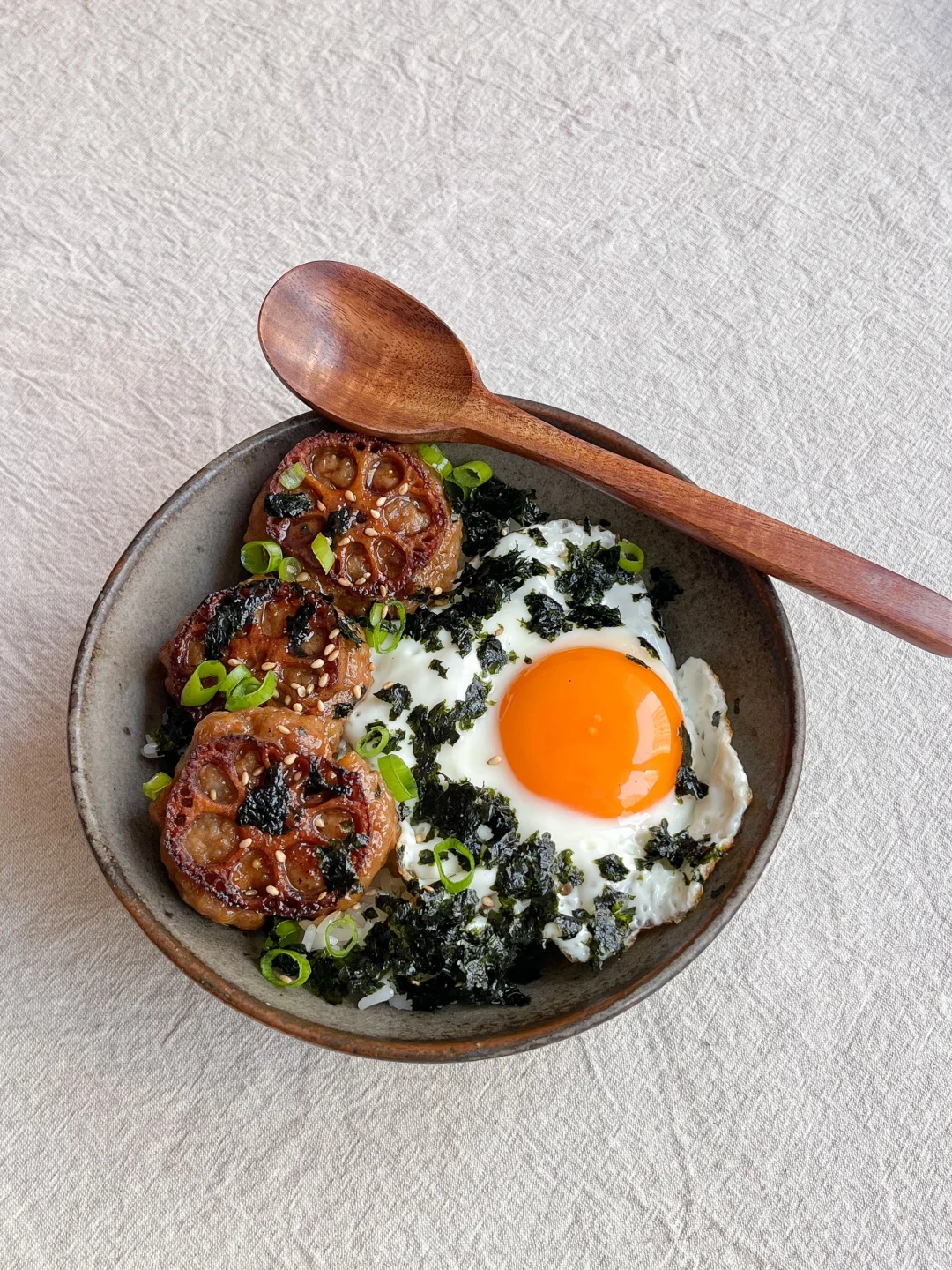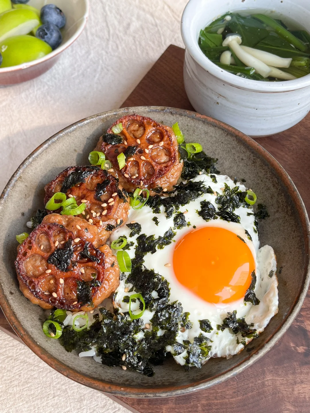 今日午餐: 藕饼煎蛋饭🍳 柴鱼豆腐🥞 小白菜蘑菇汤🥣 番茄拌金枪鱼🍅 今天突然想吃藕盒了 翻了翻冰箱 找了一点肉馅和虾滑 加上藕碎弄一个肉饼 不用切的太碎 带点颗粒吃着更有口感 一点生抽、胡椒粉、白糖、蚝油、料酒、盐 香油 用筷子或手搅拌上劲 团成肉饼 再切一片薄一点的藕 压在肉饼上 热锅冷油 小火慢煎 煎到金黄加一点烤肉酱 刚出锅可别嘴馋 里面很烫的~~~