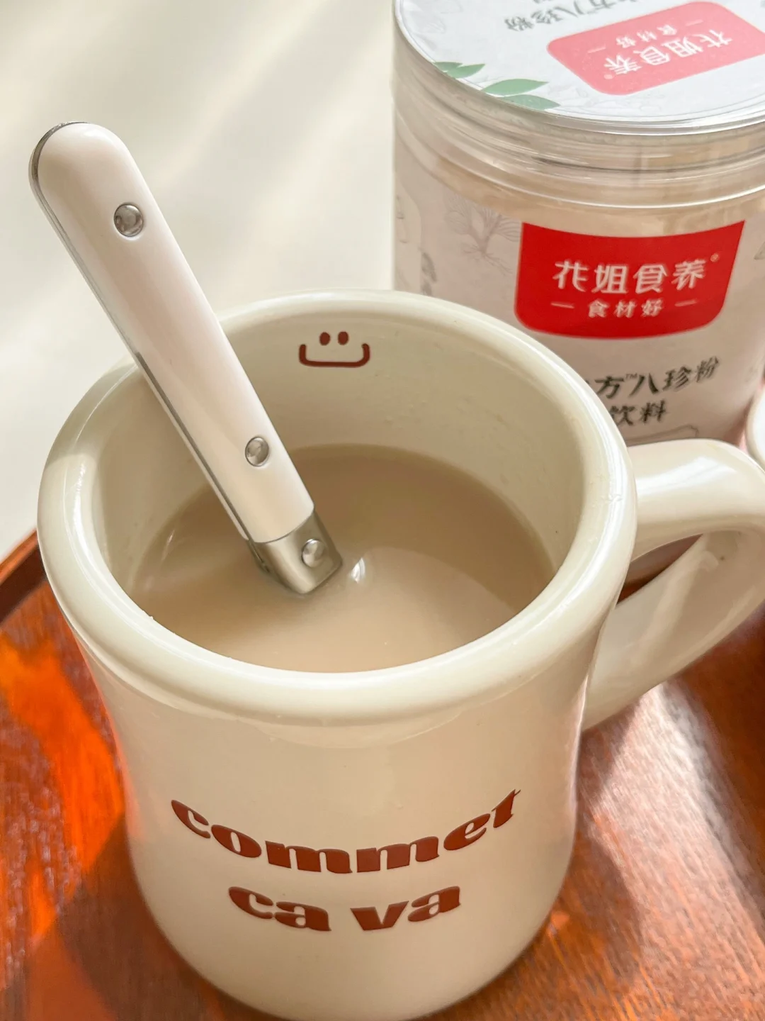 除了在家煲汤和熬粥,平时我还会喝点八珍粉,像我现在喝的花姐八珍粉里面有陈皮、怀山药、薏苡仁、莲子、芡实…这些都是健脾胃、祛湿气的好食材,没有白砂糖米粉和其他添加剂。粉质很细腻,冲的时候不容易结块,还有很香的谷物味道。如果觉得做四神汤麻烦,可以试试这个八珍粉。我懒得做早餐的话,就会冲一杯再配个水煮蛋。