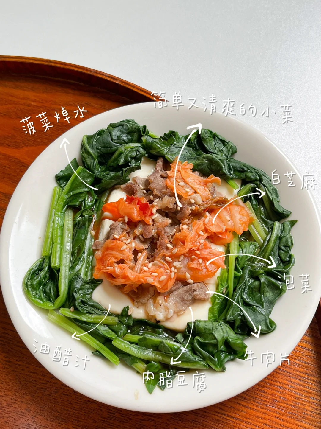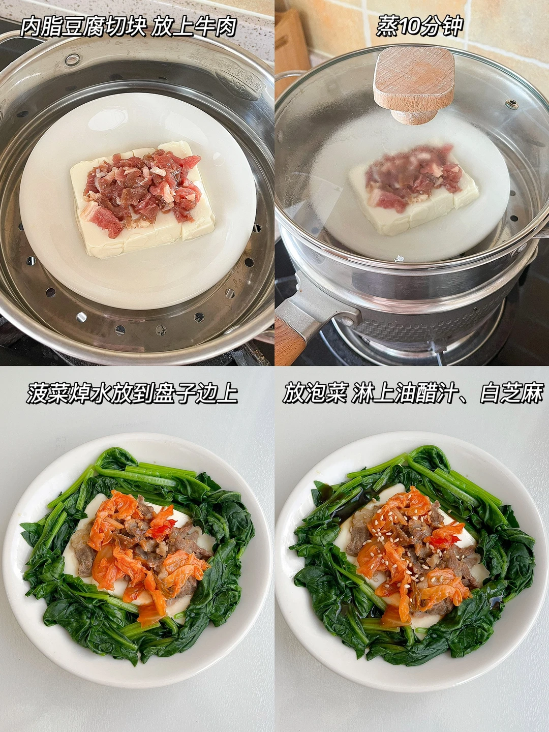 把肉和蔬菜铺在豆腐上蒸,简单又好吃!嫩豆腐切块,铺上腌好的牛肉或猪肉丝,蒸10分钟,铺上焯水的菠菜或小白菜。在牛肉上放泡菜,最后淋上一点油醋汁