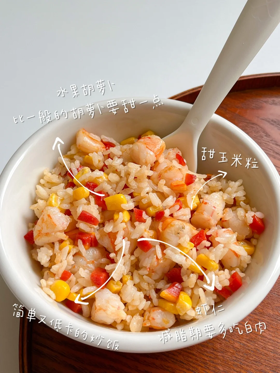 夏日低卡炒饭,放了水果胡萝卜和甜玉米粒、海虾段。水果胡萝卜味道没那么重,而且更甜一点,不爱吃胡萝卜的宝子也可以试试。放虾仁或牛肉粒都行,减脂期还是要多吃肉肉啊[萌萌哒R]