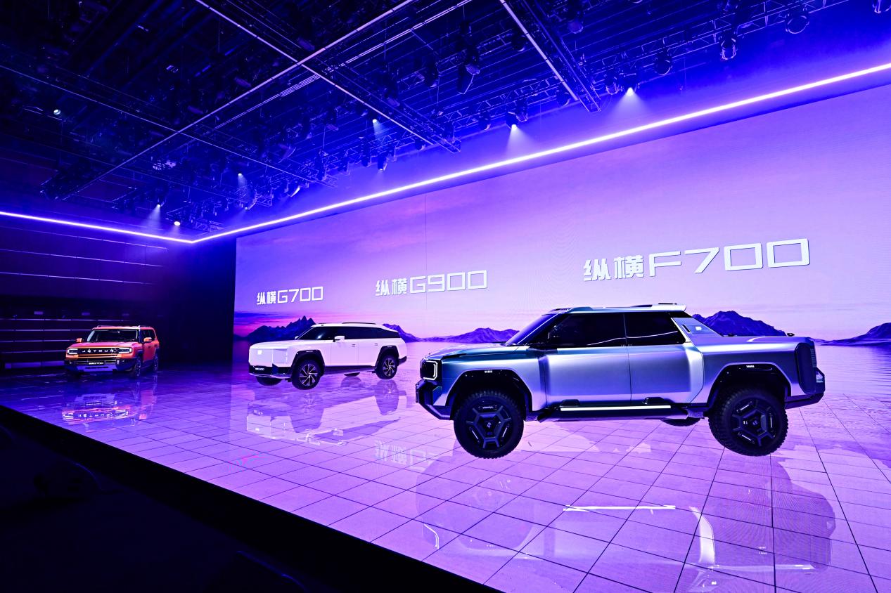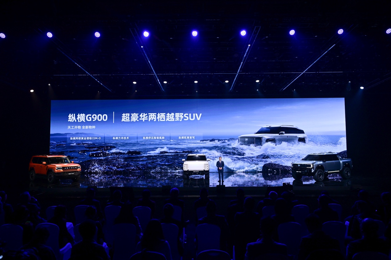 作为全地形豪华越野SUV,纵横G700搭载鲲鹏超能混动CDM-O系统,并采用非承载式车身,满足征服山河万里的探险需求。纵横F700作为全地形豪华多功能皮卡,配备智能全地形模式,可轻松应对复杂路况。纵横G900作为超豪华两栖越野SUV,搭载纵横两栖黄金增程CEM-O系统,可真正实现“穿山越海”的全场景能力,为用户带来前所未有的越野体验。