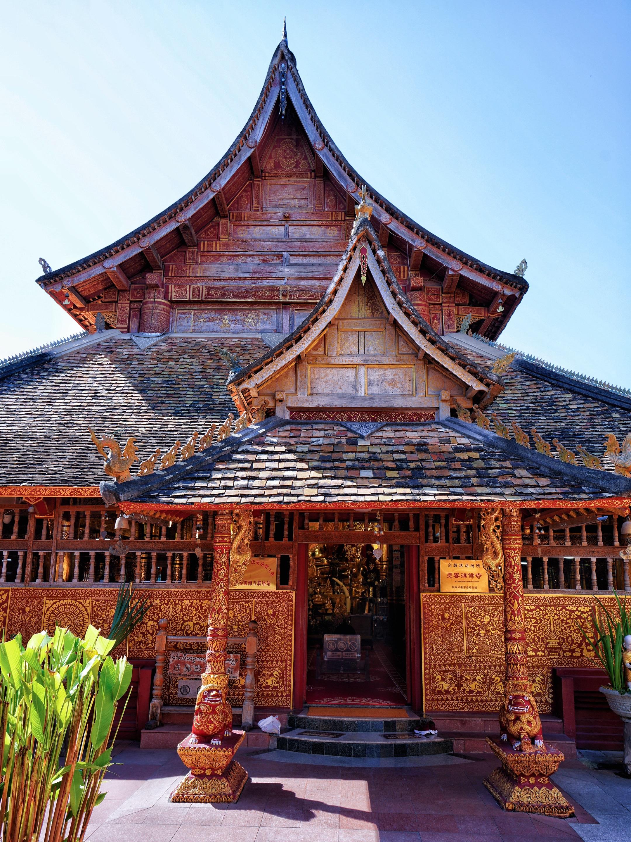 西双版纳傣族园,你可以不去泼水广场,不去孔雀园,不去边境码头,但一定要看曼春满佛寺,它江湖地位老高了,这是一座千年古刹,又是版纳少有的国保单位,中国南传佛教12大寺院之一,让人不可思议的是,寺庙的修缮居然是由泰国外交部出资的,泰国国王曾十几次御赐袈裟布施于曼春满佛寺,这是什么神仙寺庙?