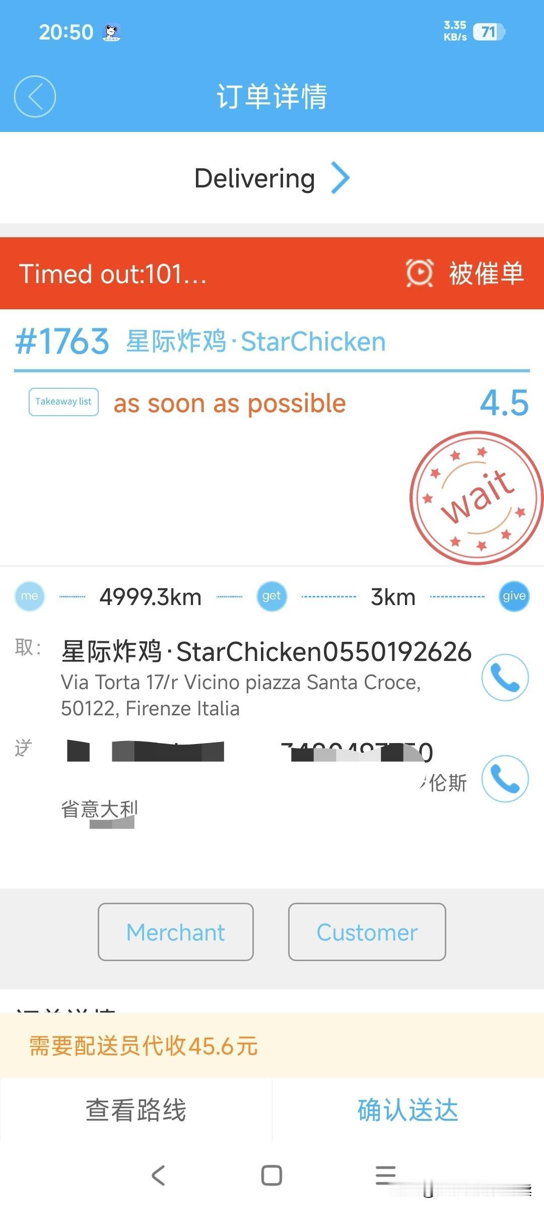 在欧洲点个外卖会饿死 派单过来已经超时快一个小时,中间送下别的单,送到他手里已经