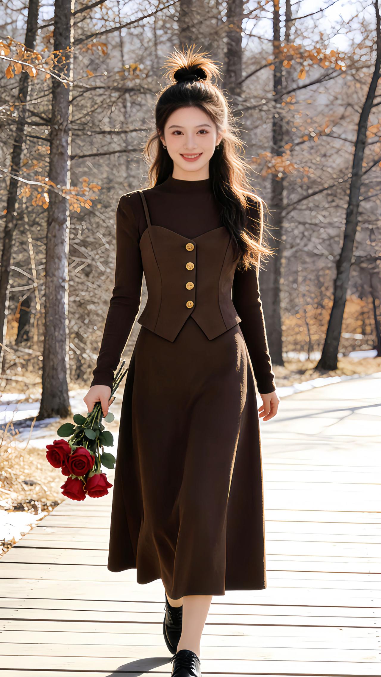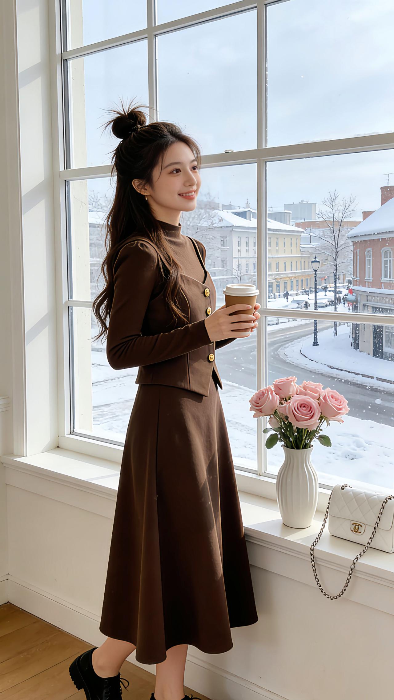 Danny站在挂着红灯笼的中式窗边,指着模特身上的咖色假两件套装,身旁的小狗乖巧依偎,加绒打底裙的面料软乎乎的超贴肤,假两件的收腰设计悄悄勾勒出腰线,复古金属纽扣还让整体多了份精致感,窗外的雪景和这套穿搭衬得氛围感拉满~ 捧着咖啡靠在窗边看雪时温柔,拿着玫瑰走在林间木栈道时又添了份文艺,A字裙摆藏肉又显腿长,咖色系和冬日的适配度超高,这款小香风套装不管日常出街还是聚会穿,都好看又自在~ 穿出你的时尚你的感觉 显瘦连衣裙推荐 小香风套装 假两件连衣裙 高级感穿搭 @图文带货帮扶中心 @DOU+上热门
