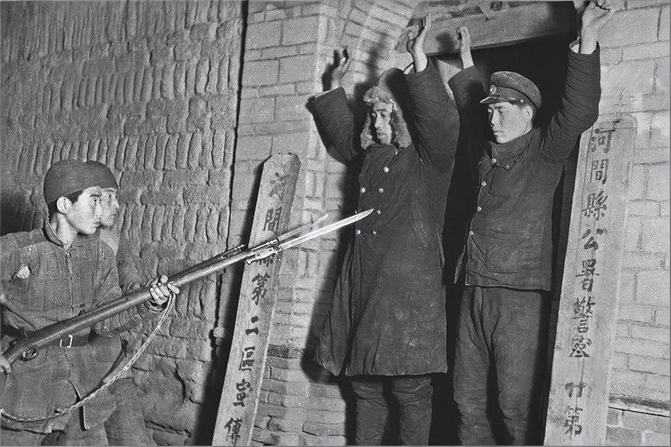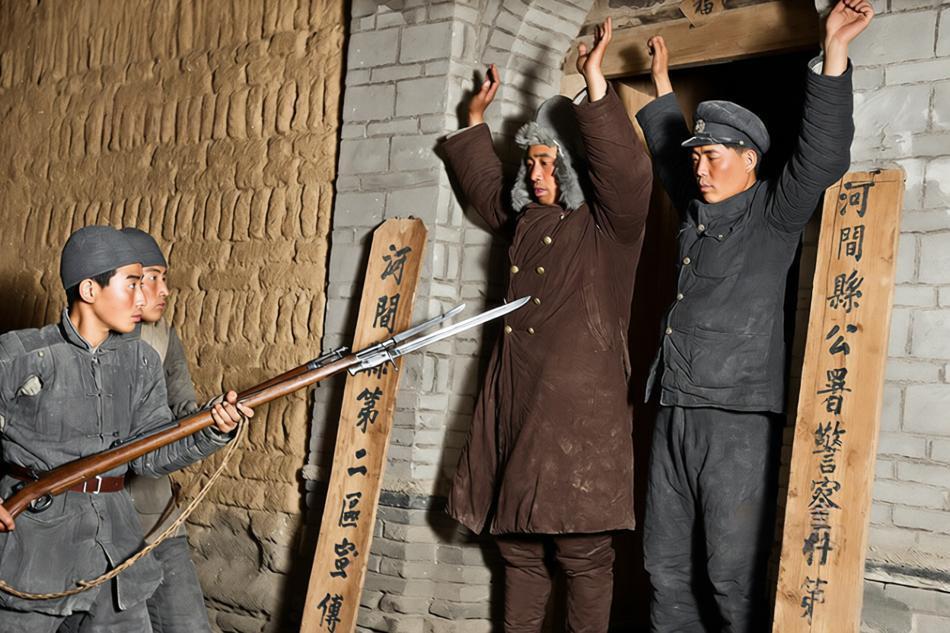 这张照片拍摄于1945年3月,河北省河间县城,由晋察冀画报社战地摄影记者在战斗结束后立即拍摄。真实记录了八路军冀中军区部队夜袭河间县城、伪警察局瞬间崩溃、举手投降的经典一幕。 八路军战士持三八式步枪瞄准门口,目光警惕而坚定。两名伪警察高举双手,面露惊恐与无奈,一人举枪,一人空手,身体紧贴门框,彻底丧失抵抗意志。门柱上书写“河间县公安局第二区警察所”“河间县公署警察所”等伪政权标牌,砖墙斑驳,透露出日伪统治下的破败