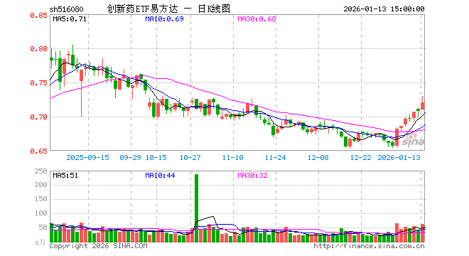 1月13日,创新药ETF易方达(516080)涨1.69%,成交额4473.48万元。当日份额增加2900.00万份,最新份额为15.57亿份,近20个交易日份额增加1.26亿份。最新资产净值计算值为11.15亿元。
