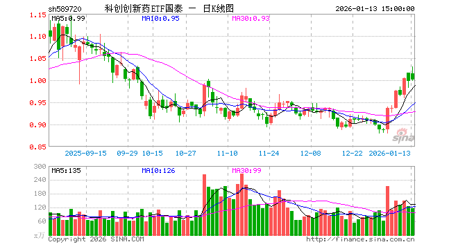 1月13日,科创创新药ETF国泰(589720)涨0.30%,成交额1.17亿元。当日份额增加1000.00万份,最新份额为7.21亿份,近20个交易日份额减少1100.00万份。最新资产净值计算值为7.23亿元。