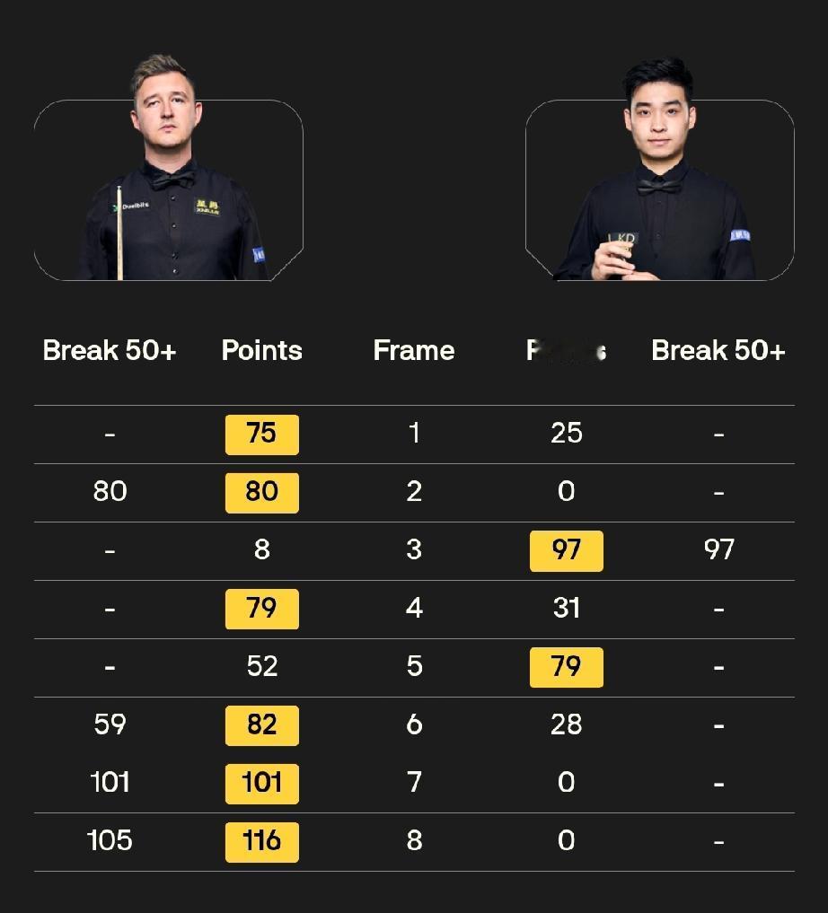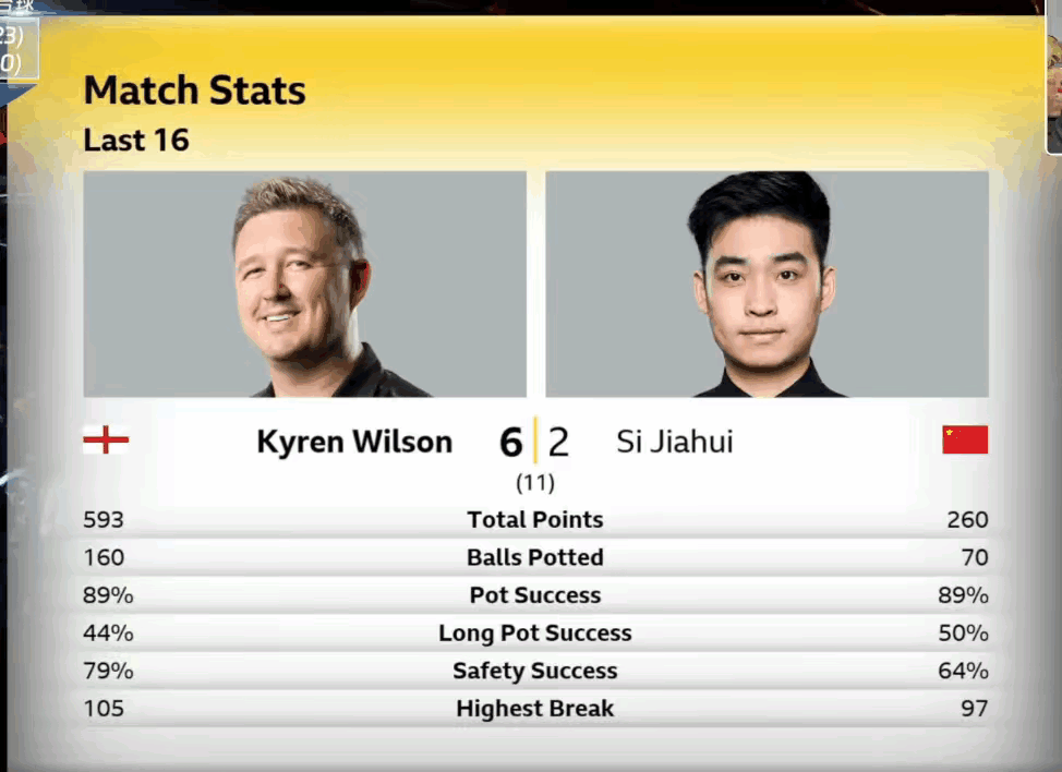 斯佳辉全场累计被罚13杆,罚分高达58分,对阵凯伦·威尔逊四连败! 1月14日,在2026年斯诺克大师赛首轮16进8的比赛中,斯佳辉以总局分2-6不敌世界排名第二的凯伦·威尔逊,无缘八强,成为中国军团第一个被淘汰的球员。 整场比赛斯佳辉只打出一杆97分的高分,而凯伦·威尔逊则轰出单杆两杆破百(101分、105分)两杆50+,在进攻火力上明显压制斯佳辉。 斯佳辉本场在防守和失误控制上表现不佳,多次出现解球失误和关键球处理不当。首局他连续解球失误被罚16分,直接导致先丢一局;第四局在有机会逆转的情况下,他出现致命击球犯规被罚7分,错失扳平比分的机会。 根据统计,斯佳辉全场累计被罚13杆,罚分高达58分,这些罚分既有解斯诺克被动造成的,也有主动防守时未能打到目标球的情况,与威尔逊在防守端的稳定表现形成鲜明对比。 下半场第六局开始,斯佳辉的专注度明显下滑,进攻失误增多,防守不到位直接给对手留下上手机会。威尔逊在最后三局打出单杆59分、101分和105分,以一波"三连鞭"带走比赛,而斯佳辉在这三局中总共只得到28分。 从技术统计来看,斯佳辉在安全球成功率方面明显落后于威尔逊,差距达到24个百分点,这是他本场最大的短板。 总体而言,斯佳辉本场比赛在防守和失误控制上的问题让他难以与世界第二的凯伦·威尔逊抗衡。