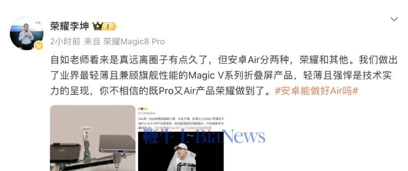 据了解,王自如曾借荣耀“既Pro又Air”新机,点评Air系列产品。