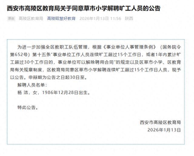 1月13日,据西安市高陵区教育局官方账号“高陵昭慧好教育”,一小学职工连续旷工超15日被解聘: