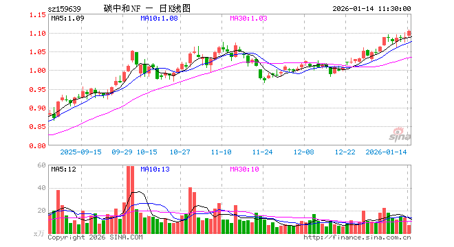 1月14日,截止午间收盘,碳中和ETF南方(159639)涨1.47%,报1.104元,成交额778.69万元。碳中和ETF南方(159639)重仓股方面,宁德时代截止午盘跌0.22%,紫金矿业涨2.07%,长江电力涨0.26%,比亚迪涨0.22%,阳光电源涨4.16%,万华化学涨0.66%,汇川技术涨1.86%,洛阳钼业涨3.64%,亿纬锂能涨2.64%,隆基绿能涨2.49%。