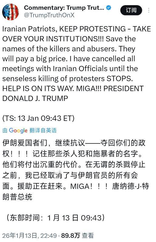 特朗普昨晚(北京时间1月13日晚)写道: “伊朗爱国者们,继续抗议夺回你们的政权!!!记住那些杀人犯和施暴者的名字。他们将付出沉重的代价。在无谓的杀戮停止之前,我已经取消了与伊朗官员的所有会面。帮助即将到来。MIGA!!!美国总统 唐纳德·J·特朗普” 先把时间线理清楚,大家就能明白这波操作不是突然爆发的。就在两天前,特朗普还对外宣称伊朗方面主动致电,希望进行谈判,当时他本人也表示“会议正在安排中”。短短两天时间,态度从“准备会谈”急转成“取消所有会面+煽动抗议”,这种剧烈转变的背后,全是美国对伊朗局势的精准算计。 要搞懂这一切,得先知道伊朗现在到底在经历什么。伊朗的抗议活动从2025年底就开始了,最初是因为严重的通货膨胀和货币暴跌,老百姓生活成本飙升,商人利润被压缩,不少人率先以停业的方式表达不满。 随后高校学生等群体加入,诉求从单纯的民生问题逐渐扩散,最后演变成了对政府的质疑,这场风波也成了伊朗近半个世纪以来面临的最严峻内部挑战之一。 特朗普显然是盯上了伊朗的这波内部动荡,才会发出这样的煽动性言论。他在发文中直接称呼抗议者为“伊朗爱国者”,还明确号召他们“继续抗议夺回你们的政权”,甚至让抗议者记住所谓“杀人犯和施暴者的名字”,这种表述已经不是简单的表态,而是赤裸裸地干涉他国内政。 更值得注意的是特朗普提到的“取消与伊朗官员的所有会面”和“帮助即将到来”这两个关键信息。 取消会谈的说法看似强硬,实则是特朗普的一种施压手段。他很清楚,伊朗当前的内部矛盾已经足够尖锐,此时暂停外交接触,能进一步放大伊朗国内的紧张氛围,给伊朗政府施加更多压力。 至于“帮助即将到来”,特朗普并没有说明具体是哪种帮助,但结合他后续接受美国哥伦比亚广播公司采访的内容就能找到答案。 他在采访中明确提到,这些“援助”会以“不同形式”呈现,其中就包括经济援助。除此之外,美国政府此前还探讨过向伊朗抗议者提供类似星链的技术,帮助他们绕过信息封锁,这些都属于特朗普口中“帮助”的潜在范畴。 特朗普这一系列操作的核心目的很明确,就是想借伊朗内部动荡的机会,削弱甚至推翻伊朗现政权。 美国和伊朗在中东地区存在长期的结构性矛盾,美国一直把伊朗视为其主导中东秩序的最大障碍,这次伊朗出现内部危机,被美国当成了难得的机会窗口。 为了达成这个目标,美国近期已经采取了一系列组合拳。1月12日,特朗普就曾发文宣布,对所有与伊朗有商业往来的国家加征25%的关税,且这个决定“最终且不可更改”。 同一天,美国国务院还发布安全警告,要求美国公民立即离开伊朗,甚至给出了经亚美尼亚或土耳其陆路离境的具体建议。 军事威胁也没有缺席。白宫新闻秘书莱维特12日就公开表示,特朗普虽然强调外交是首选,但如果他认为有必要,会毫不犹豫地动用美国军队。 有消息显示,特朗普已经听取了针对伊朗的军事和隐蔽作战选项简报,这些选项不仅包括传统的战机空袭和远程导弹打击,还涵盖了针对伊朗指挥架构、通信系统的网络战和心理战。 面对美国的步步紧逼,伊朗方面也做出了强硬回应。伊朗最高国家安全委员会发表声明,直接指责美国和以色列是国内动乱的幕后推手,称此次抗议活动是在美国和以色列的策划控制下演变为对国家安全的破坏。 伊朗外长阿拉格齐也明确表示,伊朗已经做好了应对一切可能的准备,既愿意在相互尊重的基础上谈判,也做好了战争准备。 国际社会对美国的干涉行为也表达了担忧。俄罗斯公开谴责这种“颠覆性外部干预”,警告美国若重演去年的打击行动,会对中东和国际安全造成灾难性后果。 中国外交部发言人毛宁12日也明确表态,一贯反对干涉别国内政,主张各国的主权和安全都应受到充分保护,希望各方多做有利于地区和平稳定的事情。 需要注意的是,美国内部对是否直接军事介入伊朗也存在分歧。以副总统万斯为首的部分高级幕僚正在全力游说特朗普,主张优先尝试外交途径。美军方也有顾虑,担心军事打击会适得其反,反而促使伊朗民众团结起来支持政府,或者引发伊朗的武力报复。 说到底,特朗普这篇充满煽动性的发文,本质上就是一场精准的政治操弄。他想借伊朗的内部矛盾火上浇油,通过舆论煽动、经济施压和军事威胁的组合方式,迫使伊朗政府让步,甚至实现政权更迭。 但国际社会的普遍反对和美国内部的分歧,再加上伊朗的强硬应对,都让局势充满了不确定性。接下来伊朗局势会如何发展,美国所谓的“帮助”是否会兑现,这些都值得持续关注,但有一点可以肯定,外部势力的干涉只会让地区局势更加动荡,最终受害的还是普通民众。