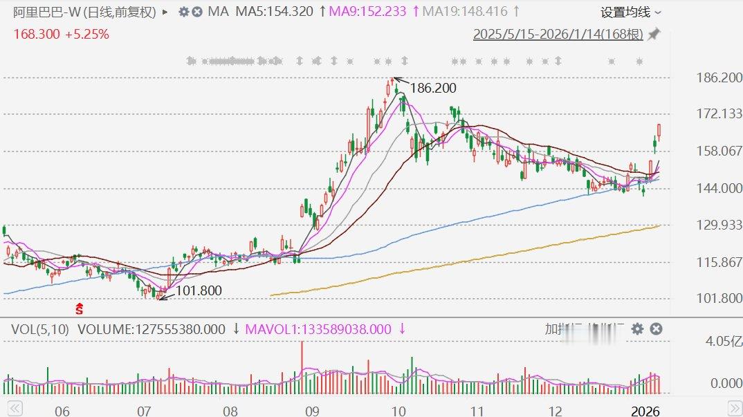 格隆汇1月14日|入选了格隆汇2026年“下注中国”十大核心资产名单的阿里巴巴(9988.HK)盘中涨幅扩大至超5%,报168.4港元,为连续第四日上涨,股价创逾2个月新高。
