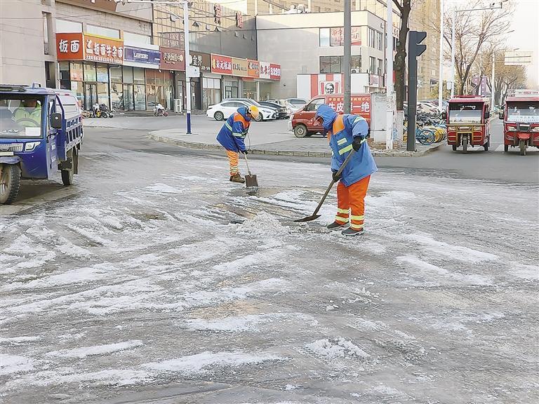 保洁人员使用铁锹、扫帚等工具,通过堆冰成堆,统一清运的方式,对道路上冻结的冰层进行铲除扫清。同时配合撒布融雪剂,加快冰层融化,以最快速度实现除冰作业,恢复道路原状。