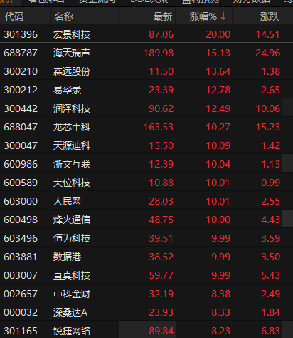 上证报中国证券网讯1月14日午后,算力概念股震荡走高,截至13时31分,宏景科技20cm涨停,大位科技、恒为科技涨停,海天瑞声、森远股份、易华录、润泽科技、龙芯中科、天源迪科涨超10%。浙文互联、烽火通信等此前封板。