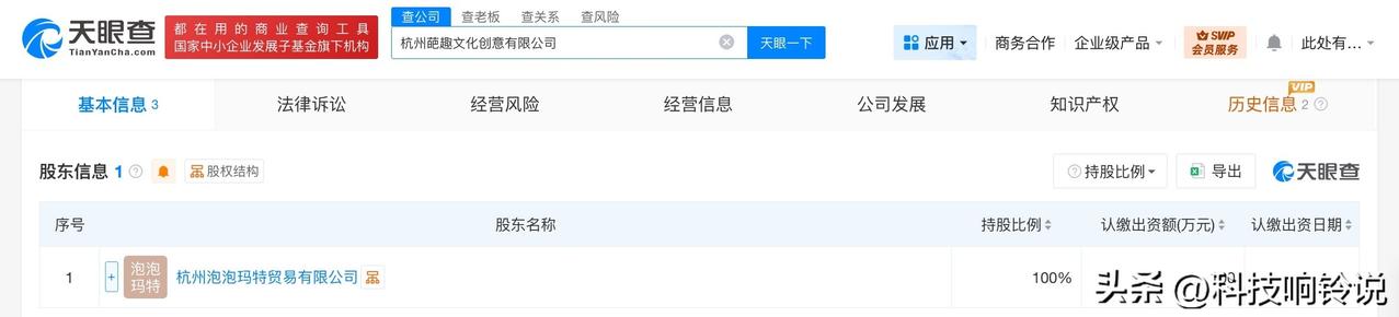 【泡泡玛特在杭州成立文化创意公司 注册资本100万】 天眼查工商信息显示,近日,杭州葩趣文化创意有限公司成立,法定代表人为代雨茹,注册资本100万人民币,经营范围含日用百货销售、日用品销售、互联网销售、人力资源服务、商务代理代办服务、个人商务服务、电子产品销售、机械设备租赁等。股东信息显示,该公司由泡泡玛特旗下杭州泡泡玛特贸易有限公司全资持股。 天眼查信息: