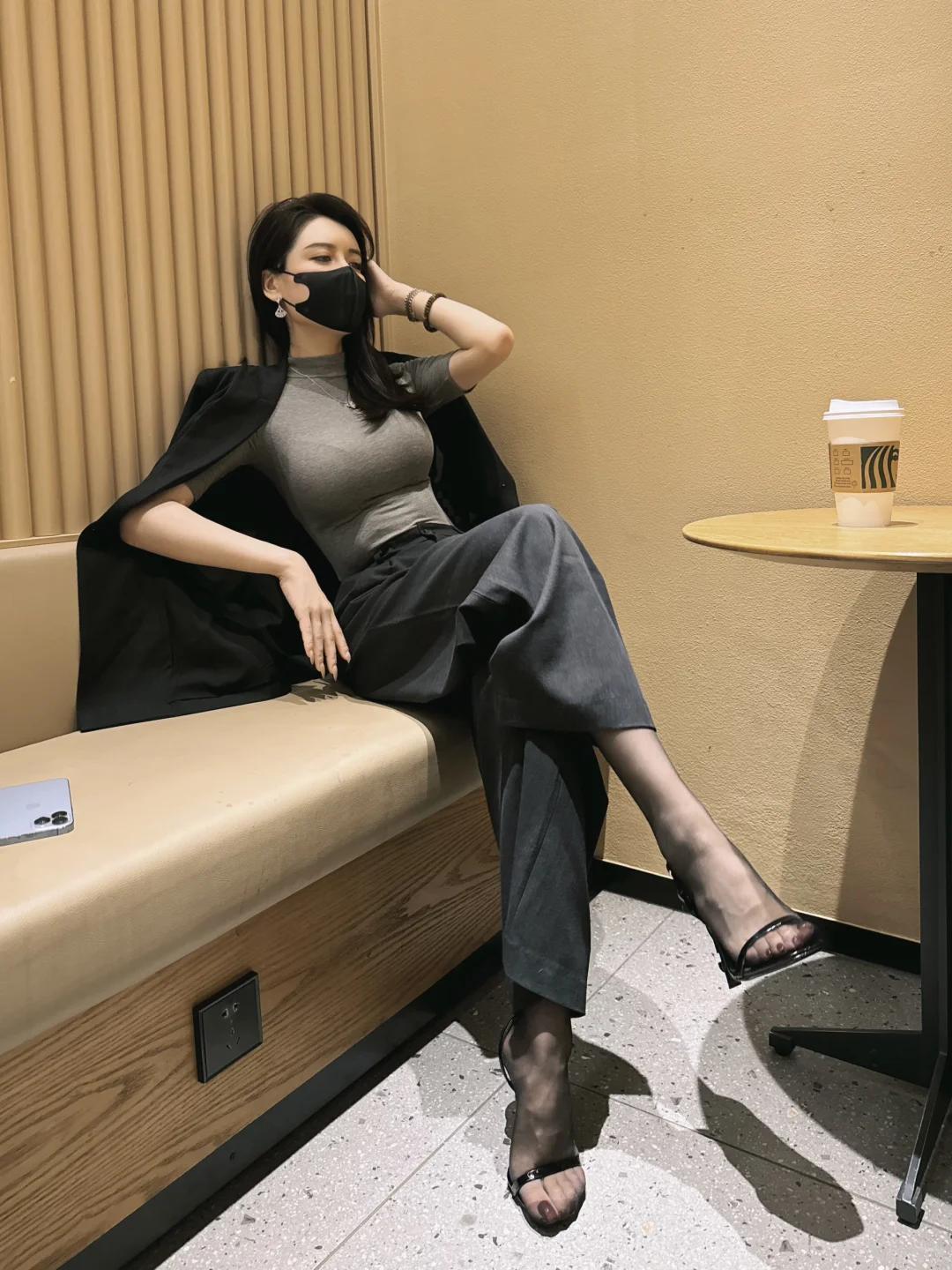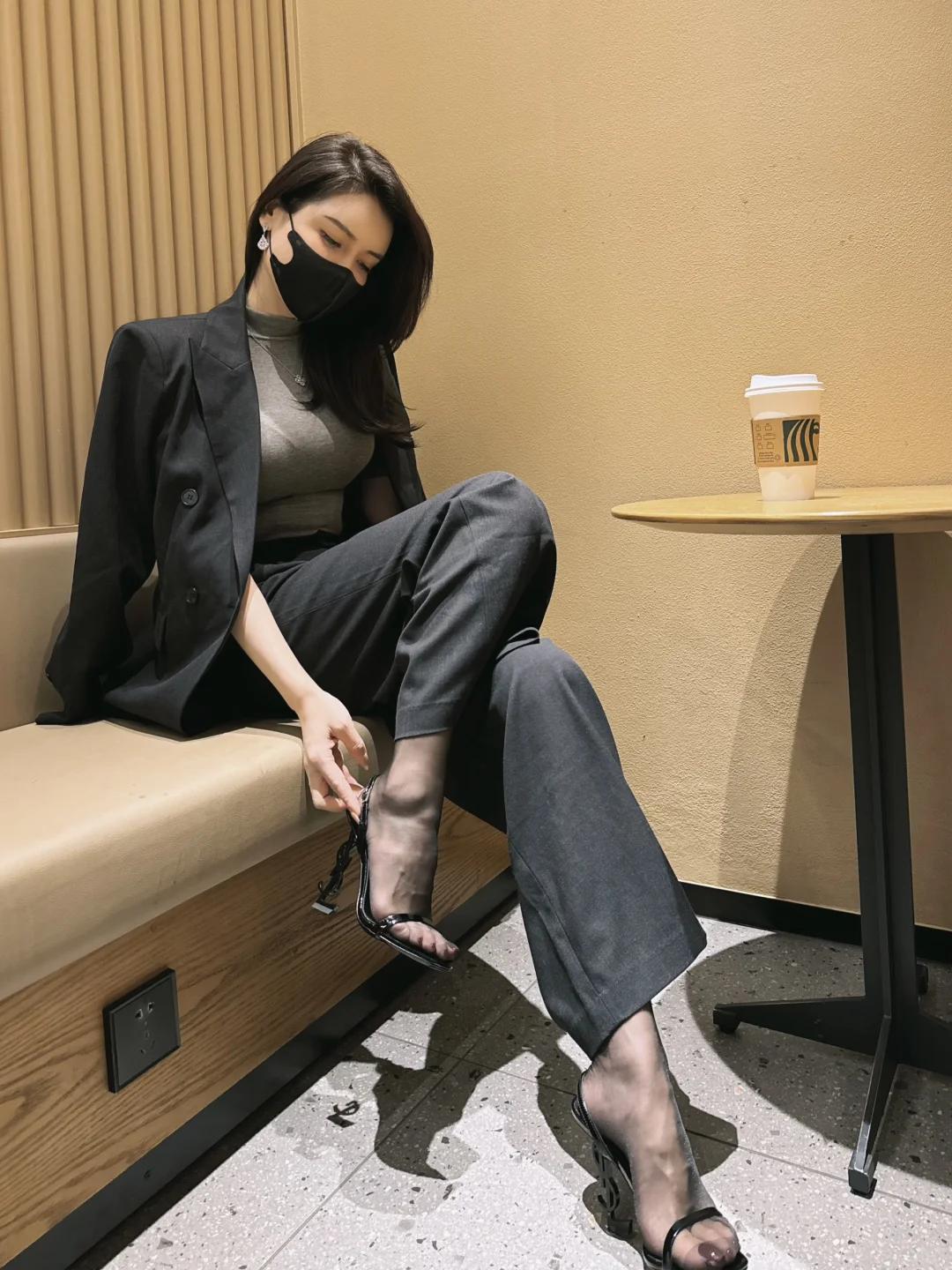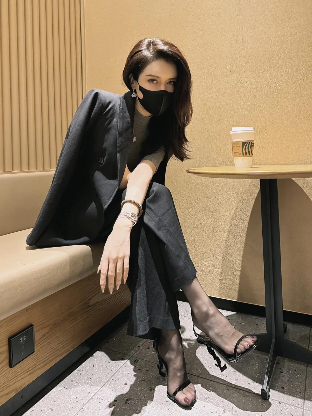 黑色外套+灰色连衣裙,搭配黑色高跟鞋,简约时尚,享受悠闲时光。