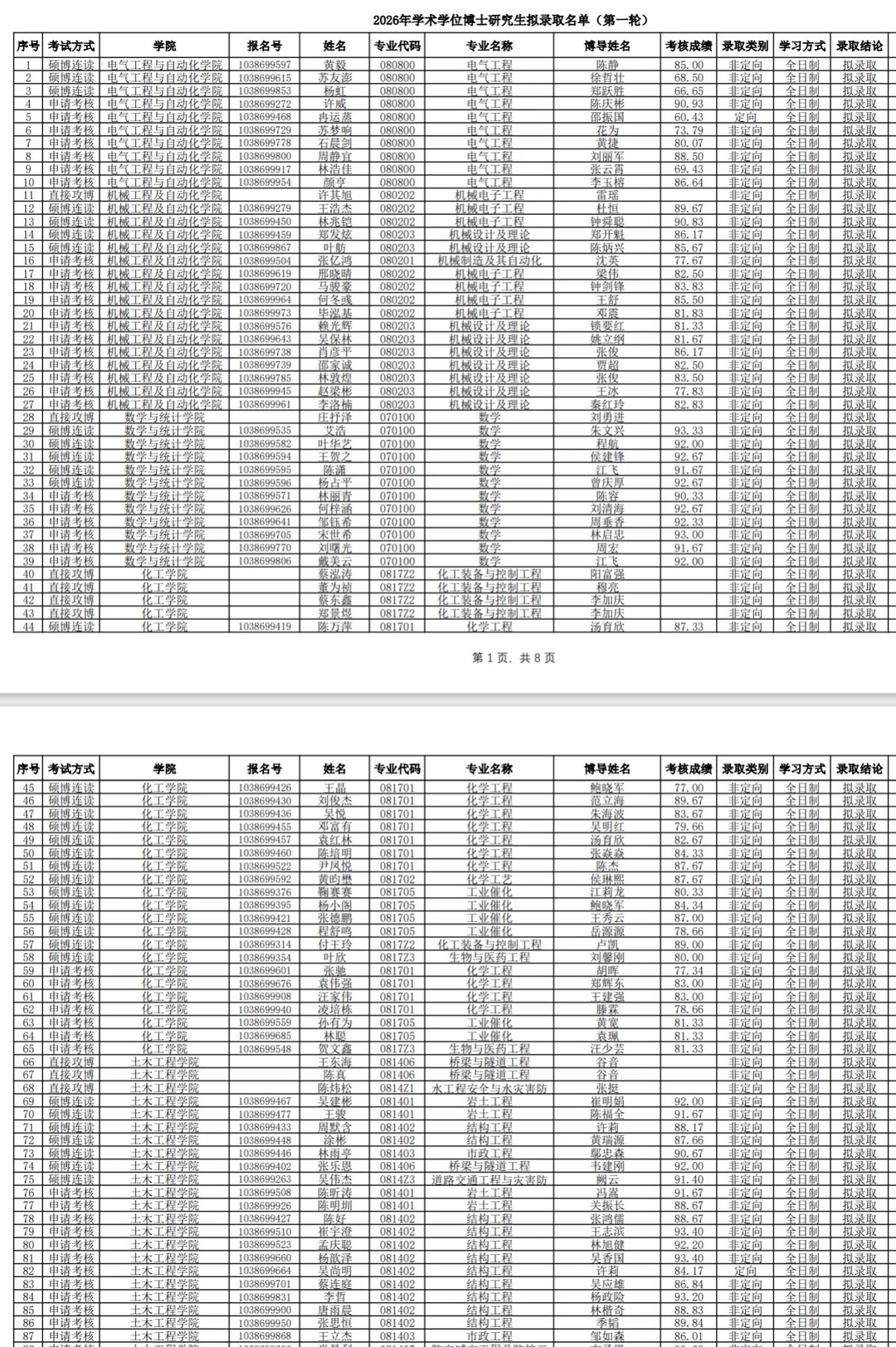 福州大学2026年博士研究生拟录取名单(第一轮)公示按照教育部、省考试院及我校的相关文件精神,根据各学院的复试情况,经审核,现将我校2026年博士研究生第一轮招生拟录取名单予以公示,具体名单见附件。公示时间为2026年1月12日-1月23日