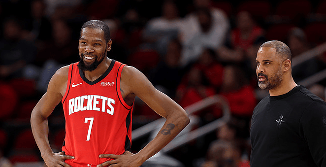 赛后,火箭球队凯文-杜兰特接受了记者采访。