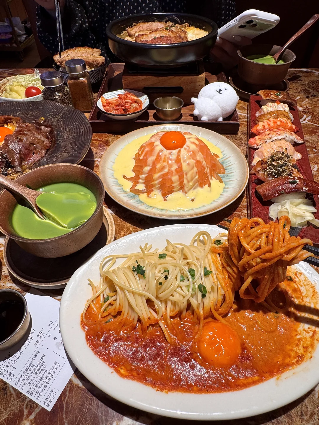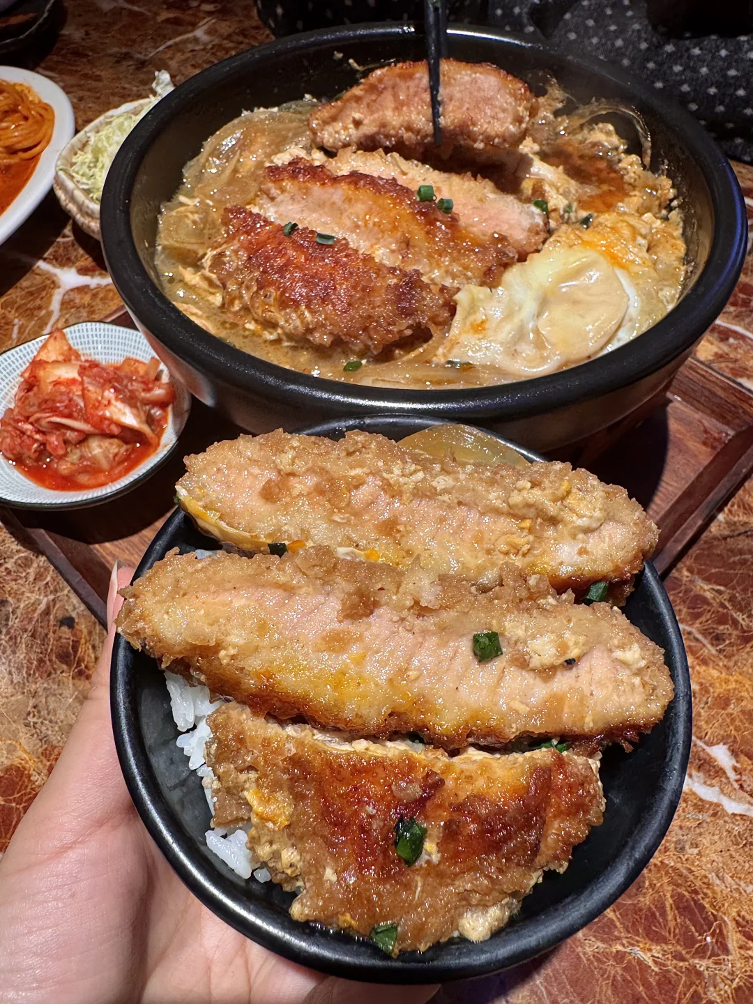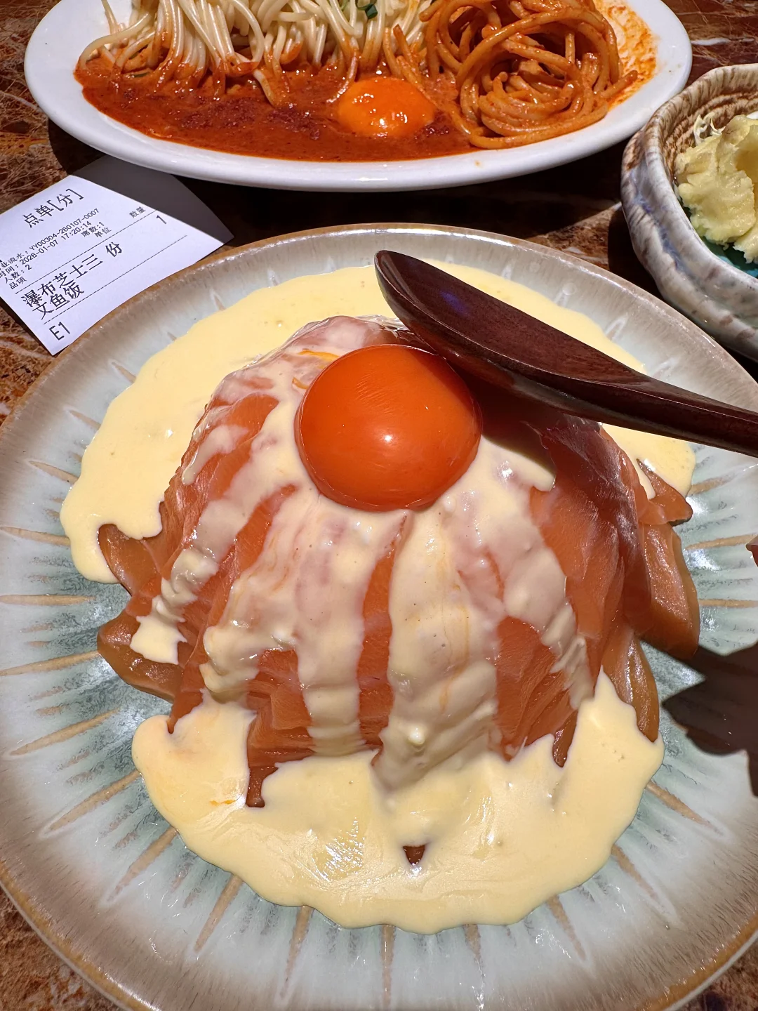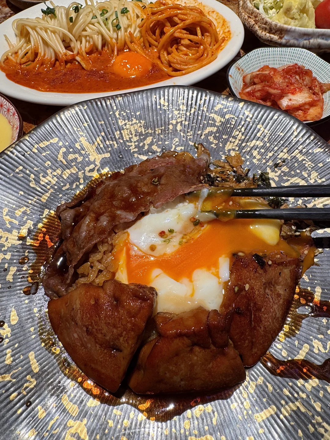 猪排蛋锅饭!简直是我的人生锅物!! 猪排酥脆的外衣被汤汁吸收浸软,肉质鲜嫩又有嚼劲!鲜甜鲜甜的,一定要边煮边吃!拌着米饭一碗下去整个人都暖了🥹 辣奶油意面、火牛寿司、芝士三文鱼饭…每次来随便点都好好吃!好适合1-2人食!叫:令谷花开)