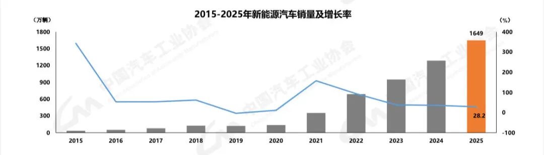 在备受关注的新能源汽车领域,中汽协数据显示,2025年,中国新能源汽车产销累计完成1662.6万辆和1649万辆,产销量再创历史新高,同比分别增长29%和28.2%,新能源汽车新车销量达到汽车新车总销量的47.9%。在新能源汽车主要品种中,与2024年相比,三大类新能源汽车品种产销均呈不同程度增长。