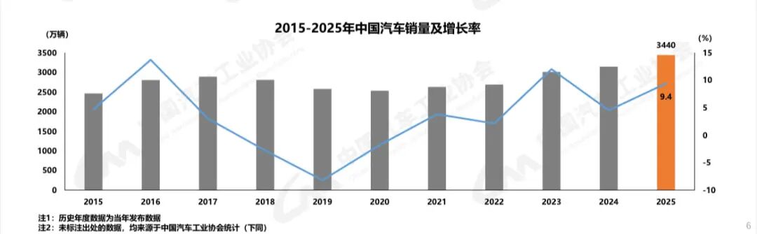 根据中汽协统计,2025年,中国汽车产销累计完成3453.1万辆和3440万辆,同比分别增长10.4%和9.4%,产销量再创历史新高,产销规模连续3年保持在3000万辆以上。