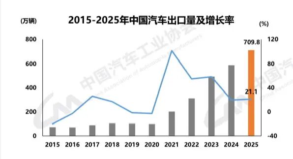 在出口方面,中汽协数据显示,2025年,中国企业愈加重视海外市场开拓,中国品牌国际竞争力持续提升,合资企业出口也有良好表现,新能源汽车出口快速增长,带动我国汽车出口再上新台阶。全年汽车出口超700万辆,达到709.8万辆,同比增长21.1%。