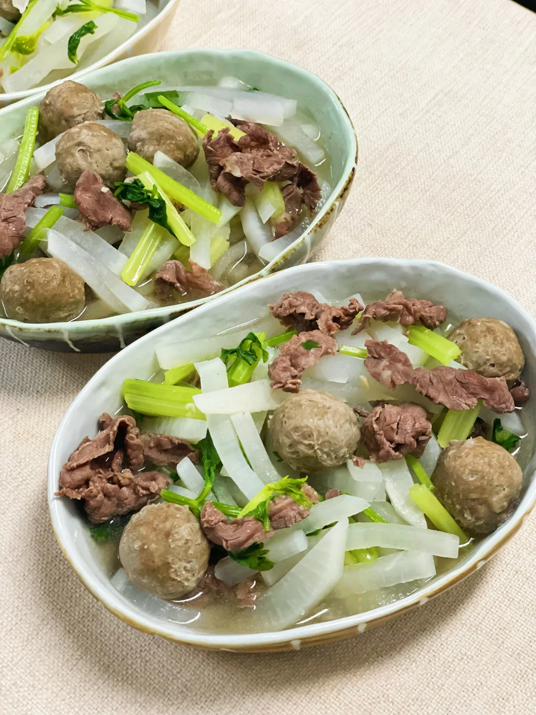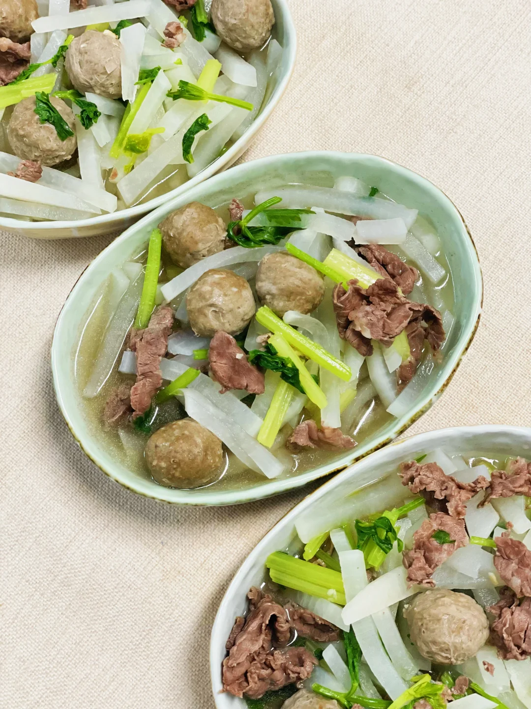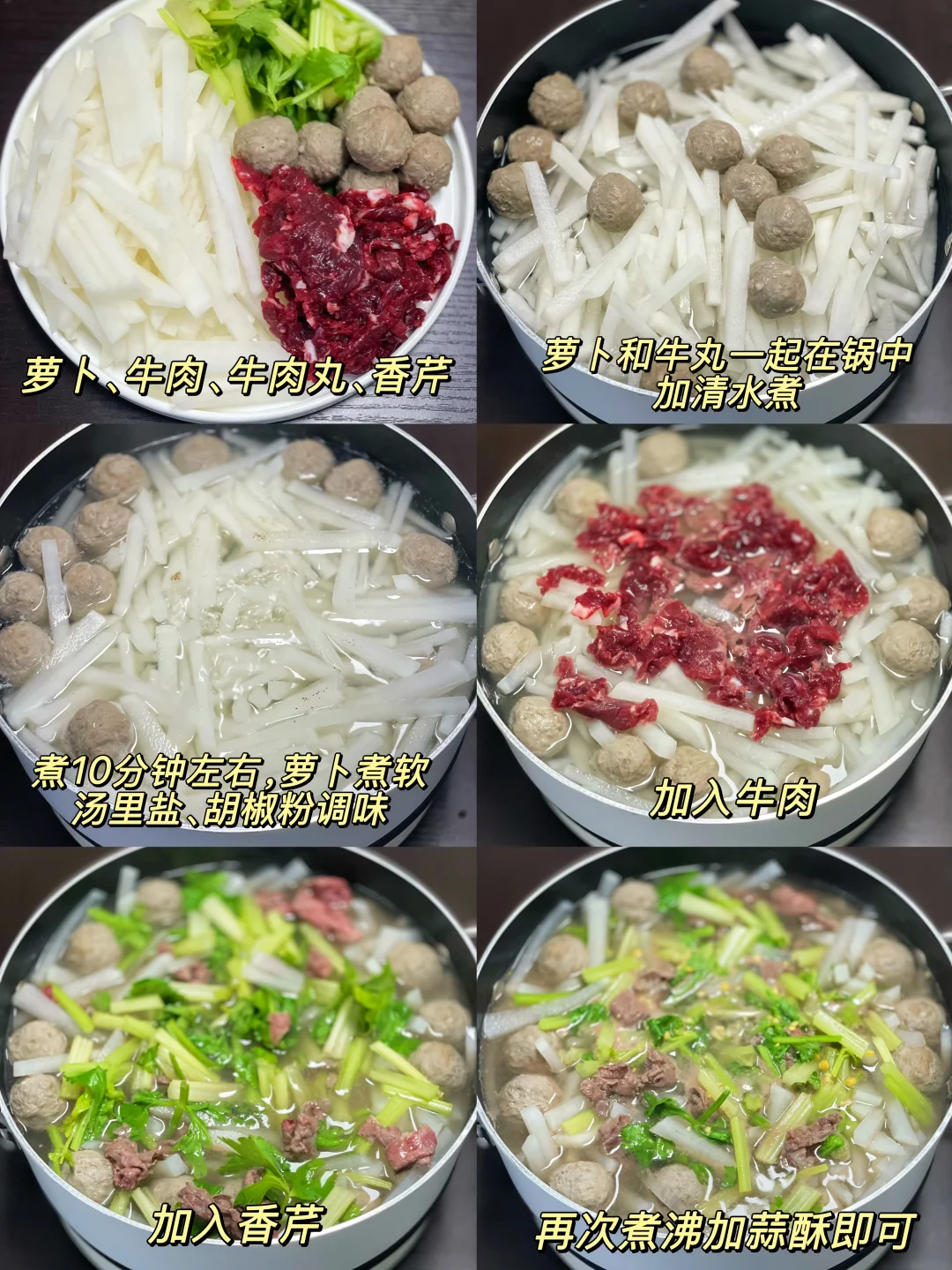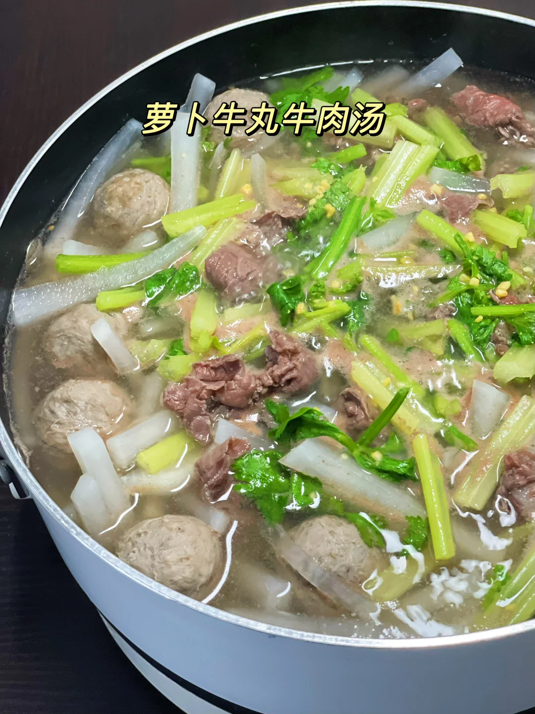 的三餐四季 🌟萝卜牛丸牛肉汤 白萝卜|牛肉丸|牛肉|香芹|胡椒粉|盐|蒜酥 1️⃣萝卜牛丸一起放锅中,加清水煮10分钟(把萝卜煮熟) 2️⃣盐、胡椒粉调味(在这一步就把汤的味道调好) 3️⃣牛肉片(不需要腌制)芹菜加入,汤再次煮开 4️⃣加蒜酥提香即可(没有也可以不放) ❤️这样煮出来的汤真的很鲜,学潮汕做法,潮汕人真的太会吃了 ❤️一锅出,蔬菜、蛋白质都有啦。全程没有加油,低卡有健康 🌟烤土豆−碳水 土豆|黑胡椒|盐 1️⃣土豆连皮整个蒸熟,压扁 2️⃣表面撒盐、黑胡椒、一点油 3️⃣空气炸锅180度烤15分钟 ❤️表面脆脆的,里面软糯口感很好 ❤️土豆也是很好的碳水哦!