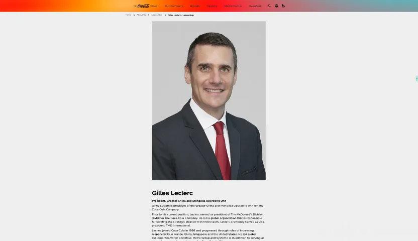 小食代还留意到,可口可乐公司官网高管介绍栏目中,吉路克(GillesLeclerc)仍然在列,其职务还是显示为可口可乐公司大中华及蒙古区总裁。