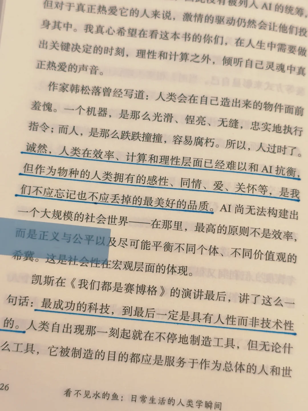 而书中最震撼的隐喻,莫过于将文化比作鱼生存的水。就像《黑客帝国》里被矩阵操控的人类,我们每个人都浸泡在由观念、规则、符号编织的隐形系统中。比如书中提到的“扫码点单困境”:当我们被迫用手机完成所有操作时,何曾意识到这是技术对人类互动方式的暴力重构?