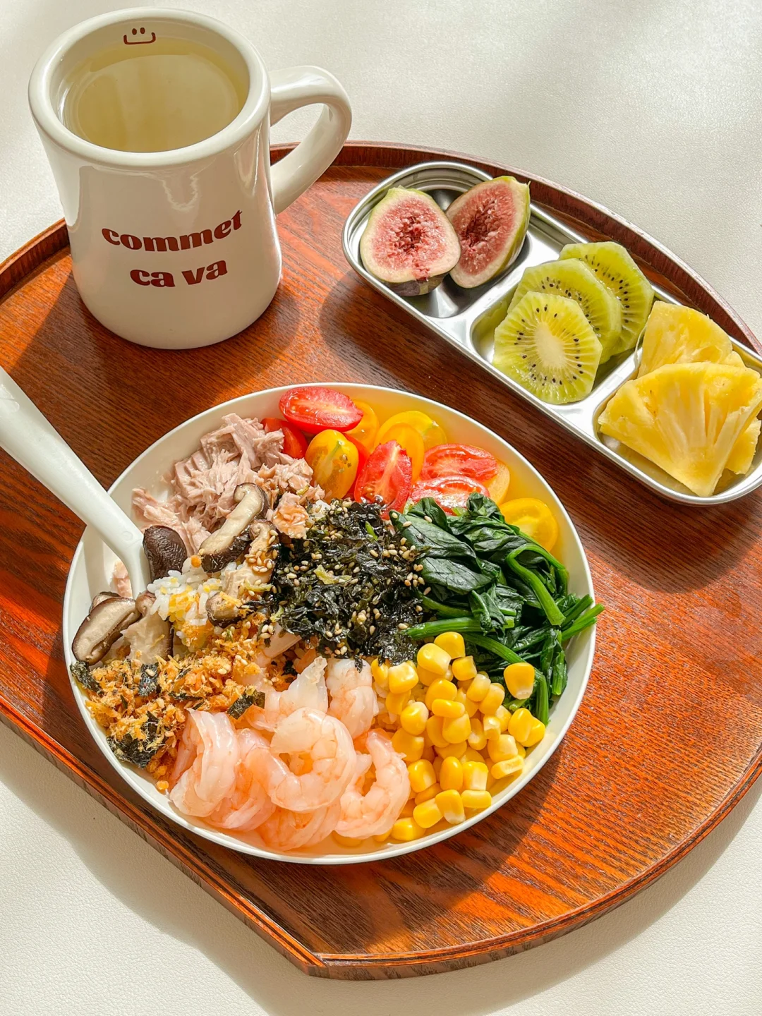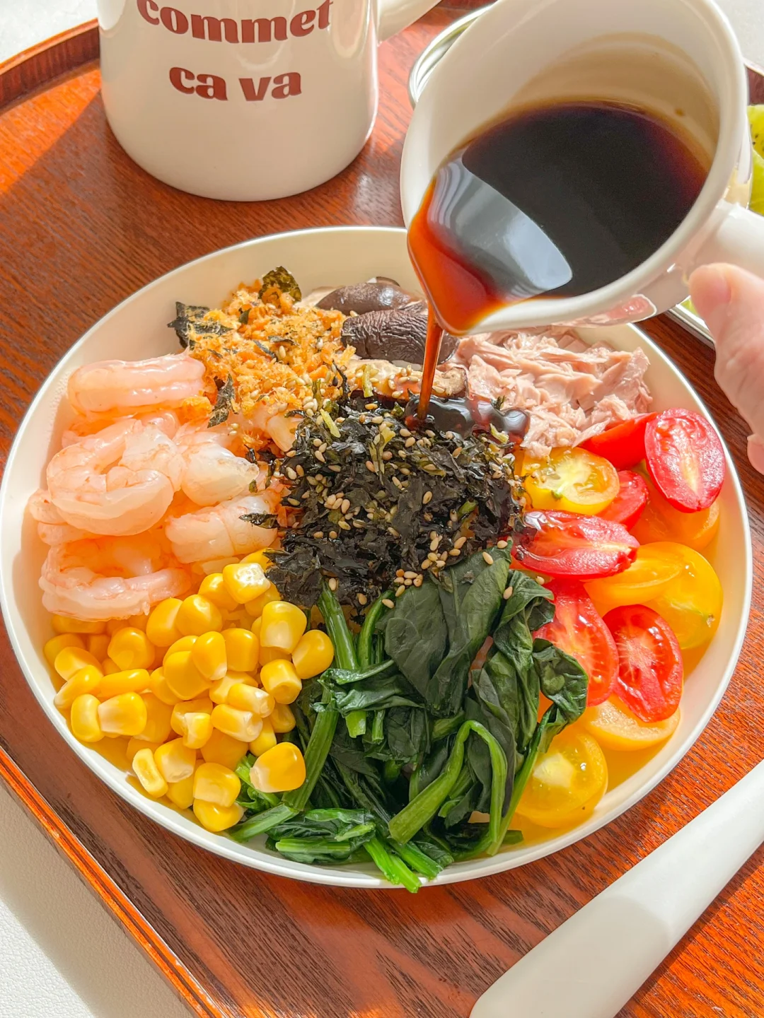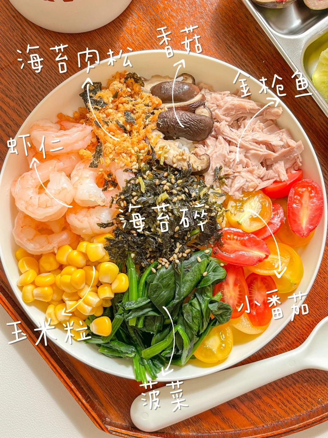 今天来做一份好吃又低脂的波奇饭 食材根据自己冰箱有的搭配就行 想吃什么就放什么 波奇饭就是随心情做 有鱼有虾有蔬菜有水果 颜色还好看 优质蛋白 膳食纤维 蔬菜 碳水都有了 淋上喜欢的沙拉酱或油醋汁或烧肉酱 拌一拌就是美味营养的一顿午餐啦 🍽【食材】 🐟油浸金枪鱼 🌽玉米粒罐头 🍅小番茄 🍤虾仁 🥬菠菜 🥓肉松海苔 🍙海苔碎 玉米饭