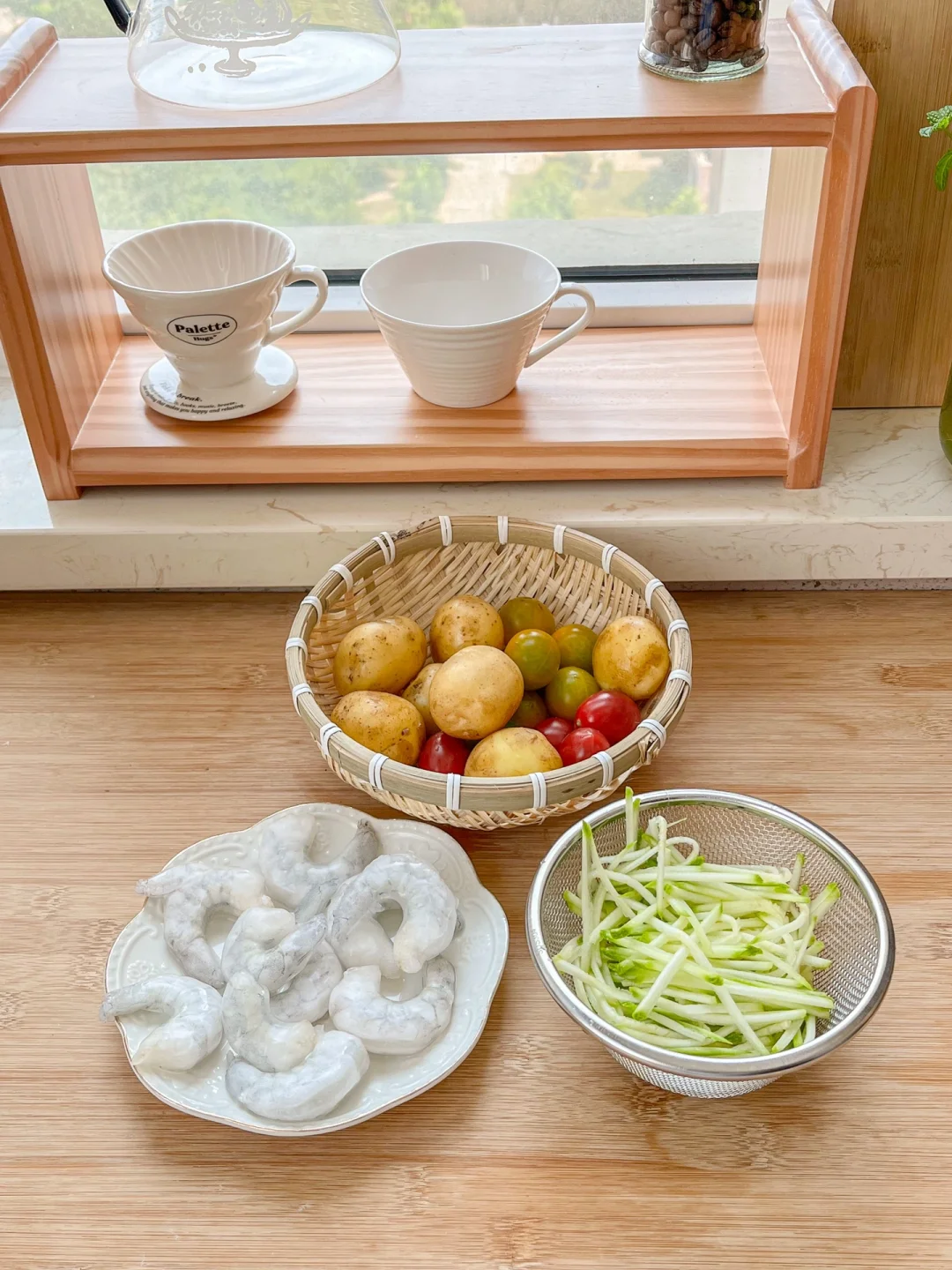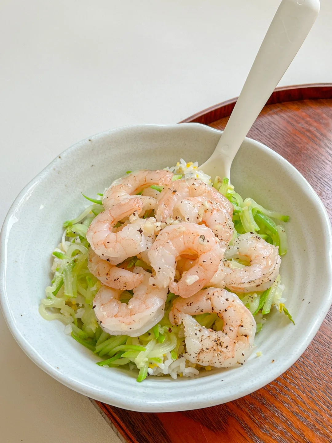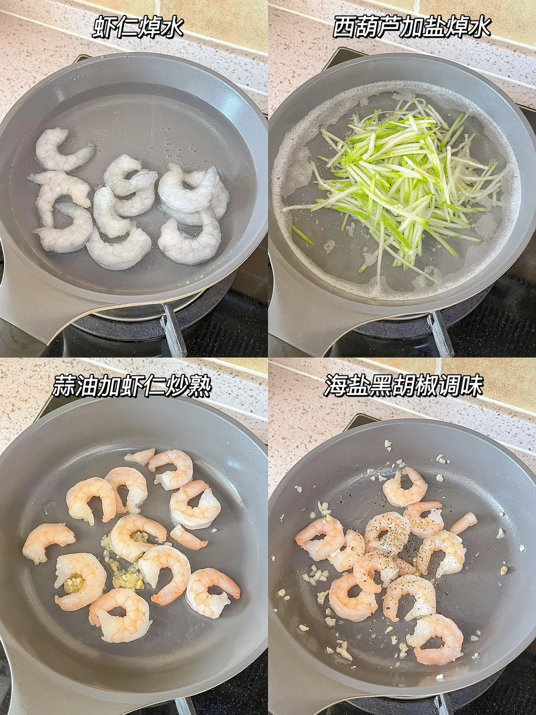 西葫芦插成丝,煮或清炒都行,我正好要煮虾仁,就一起水煮了。夏天的西葫芦清甜还多汁,虾仁加点油稍微炒一下加海盐黑胡椒调味就好了。