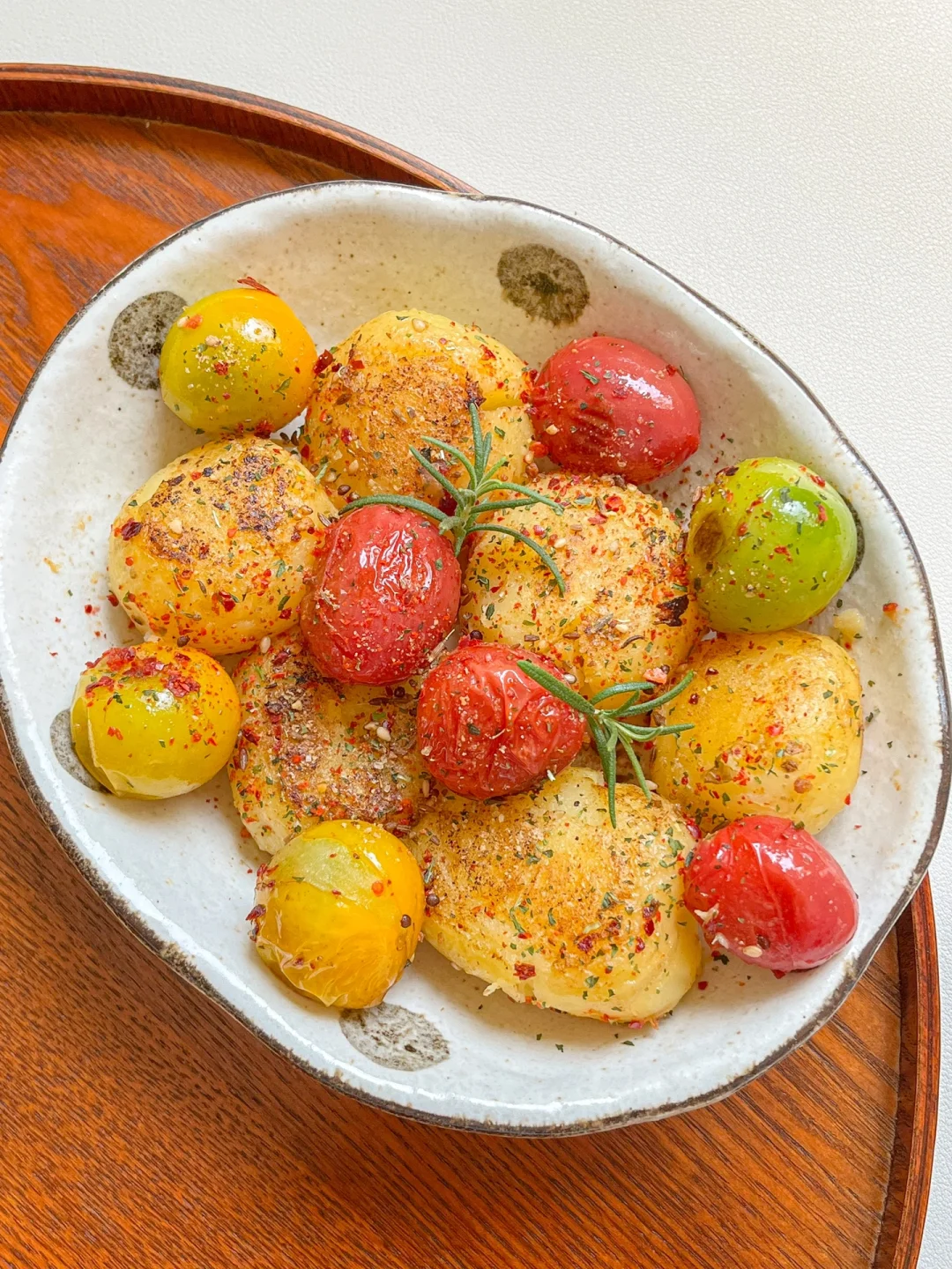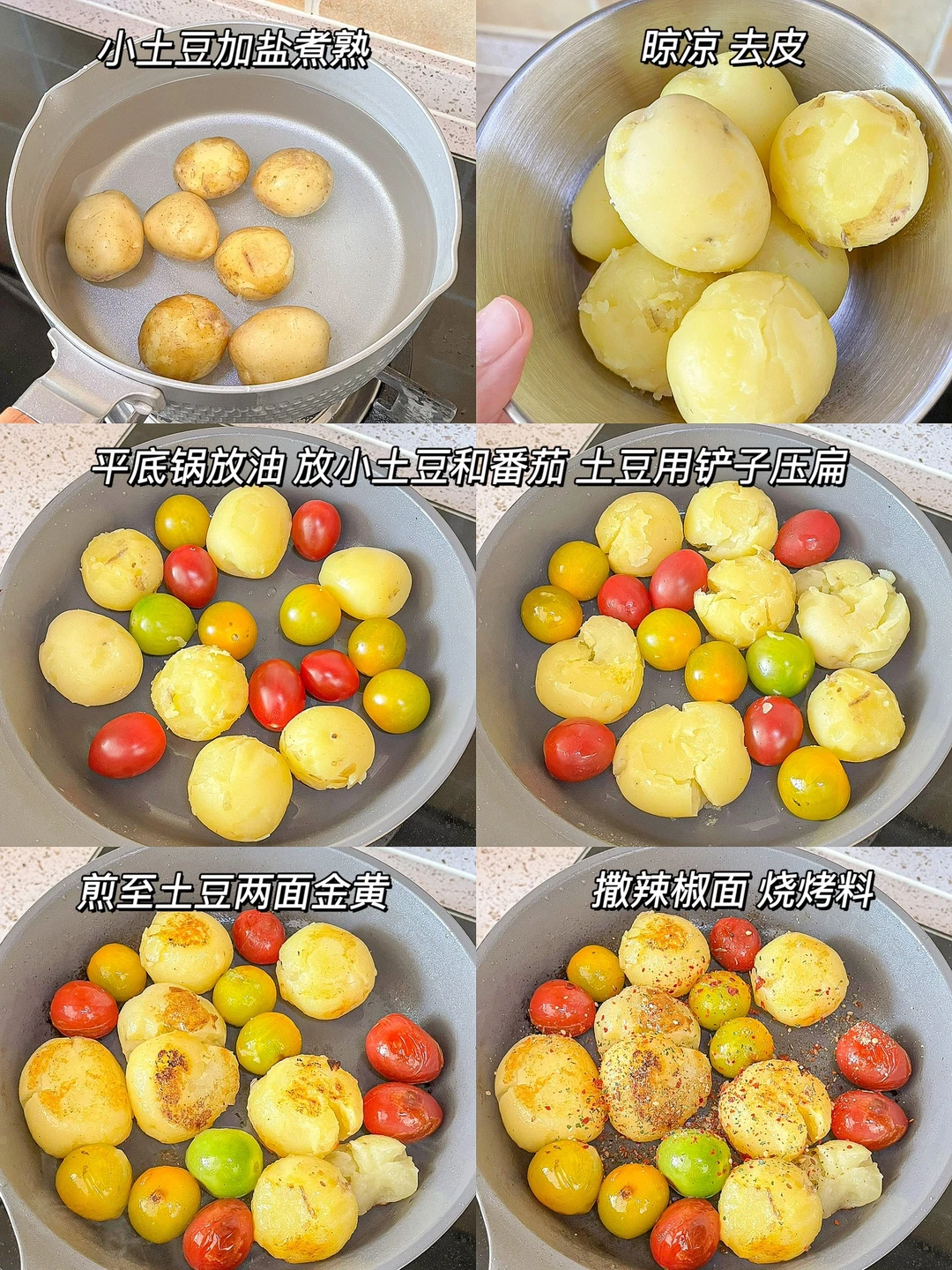 土豆是很好的主食,最近有卖新鲜的小土豆了,赶紧买了一斤,做咸菜、烤着当主食都好吃。而且水煮过很容易就剥皮了,跟小番茄一起煎一下,真的好香!再撒点烧烤料和辣椒粉,就像吃了烧烤一样,低卡还巨解馋!