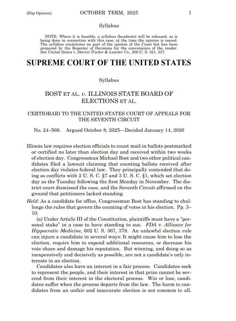 🇺🇸 邮寄投票遭受重创:美国最高法院反对延迟计票 最高法院表示,如果你正在竞选国会议员,你可以对允许选票在选举日后陆续送达的州法律提出质疑。 只要选票的邮戳日期在规定时间内即可,但候选人表示,这仍然会影响选举结果。 最高法院同意,这直接影响到他们,无论是选票丢失、资金浪费,还是选举陷入混乱。 这项裁决可能会在全国范围内引发更多类似的诉讼。 来源:美国最高法院,@EricLDaugh 🇺🇸 MAIL-IN VOTING JUST TOOK A HIT: U.S. SUPREME COURT SIDES AGAINST LATE COUNTS The court says if you’re running for Congress, you can challenge state laws that let ballots roll in after Election Day. All it takes is that the ballots are postmarked on time, but candidates say that still messes with the outcome. SCOTUS agrees it affects them directly, whether it’s losing votes, wasting money, or just getting thrown into chaos. This ruling could open the door for more lawsuits like this across the country. Source: SCOTUS, @EricLDaugh